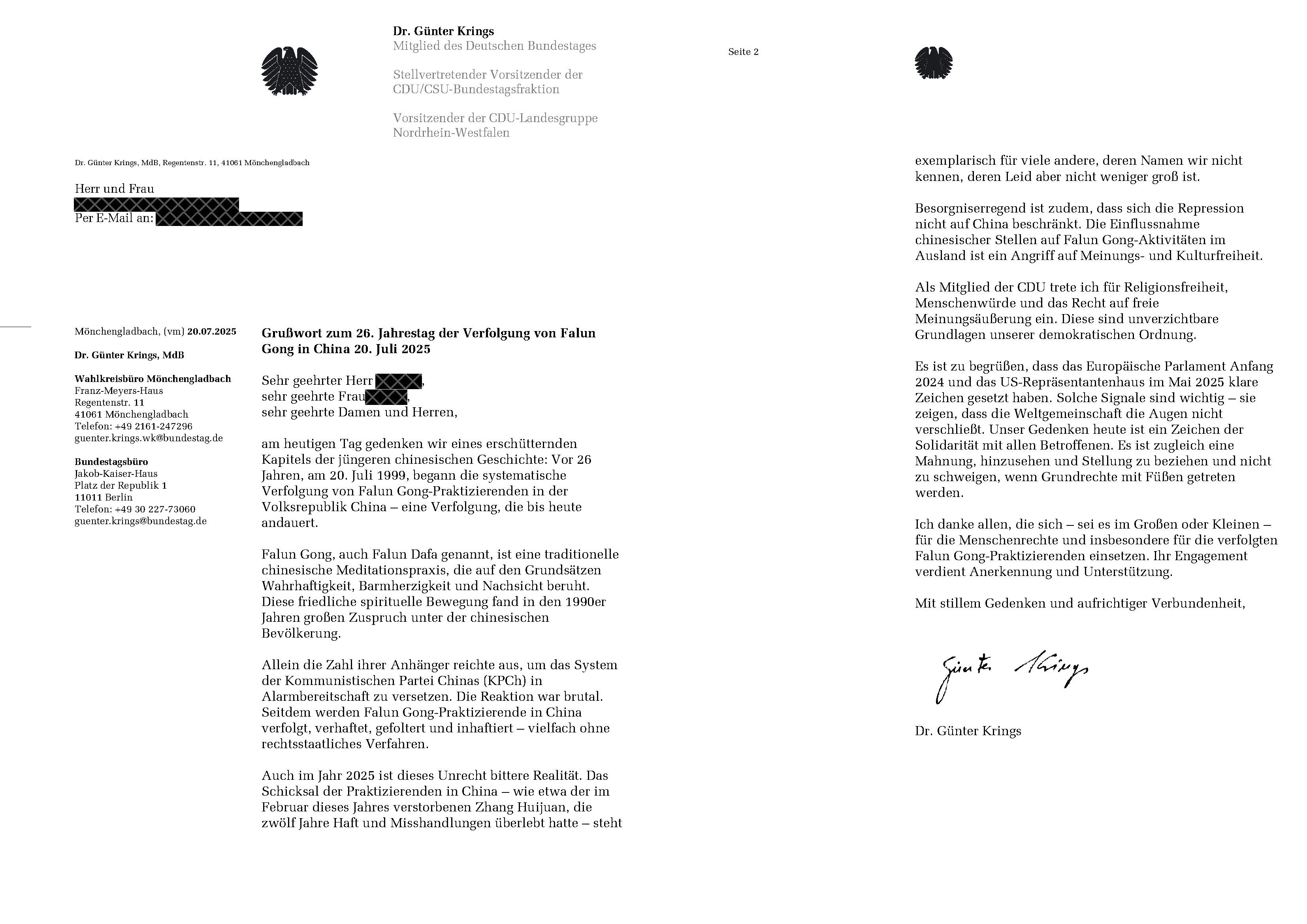 德國基民盟(CDU)聯邦議會議員、法律事務委員會成員君特﹒克林斯博士(Dr.Günter Krings)來函聲援。