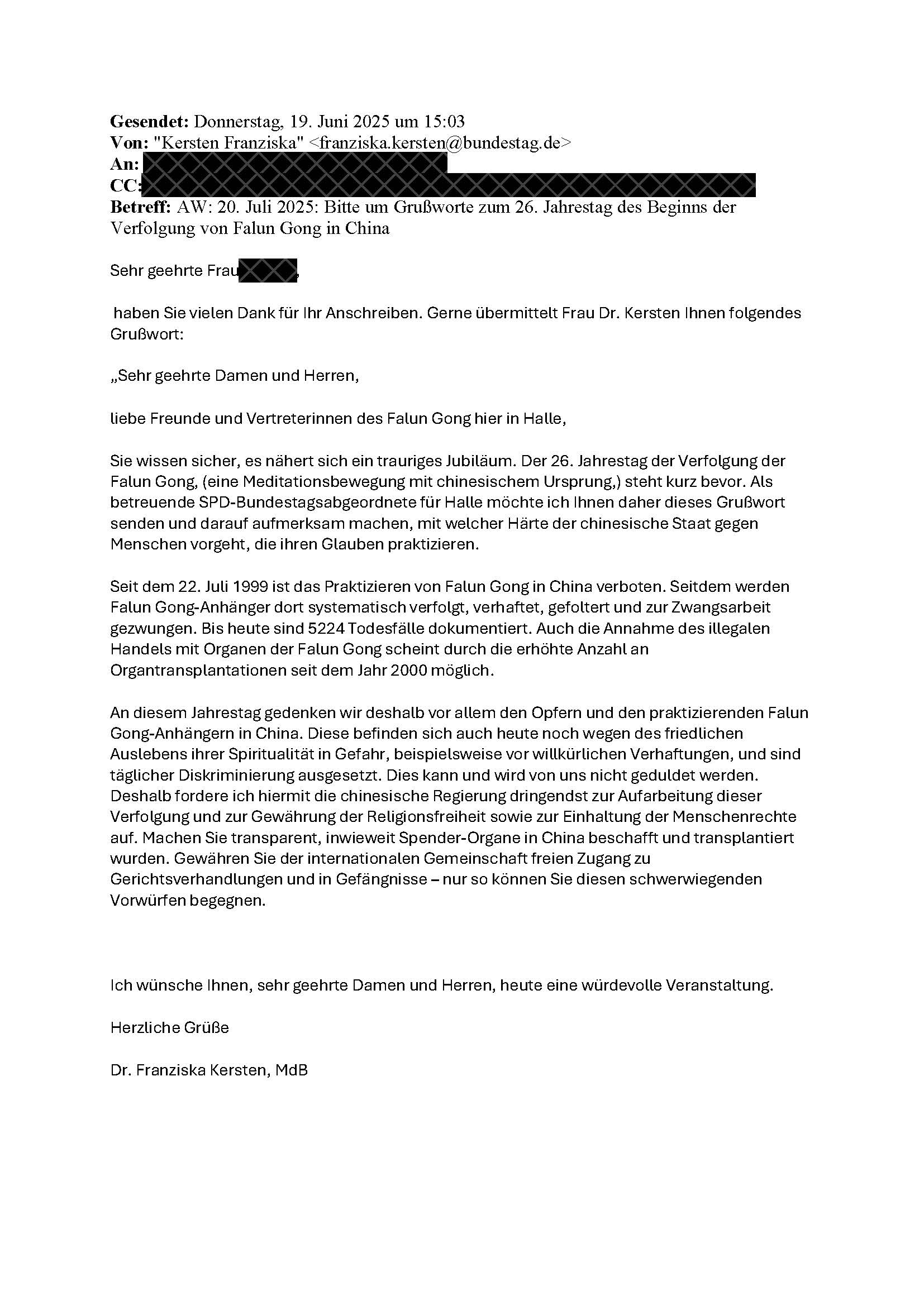 德國社民黨(SPD)聯邦議會議員,環境、自然保護、核安全和消費者保護委員會成員弗蘭齊斯卡﹒克斯滕博士(Dr. Franziska Kersten)來函聲援。
