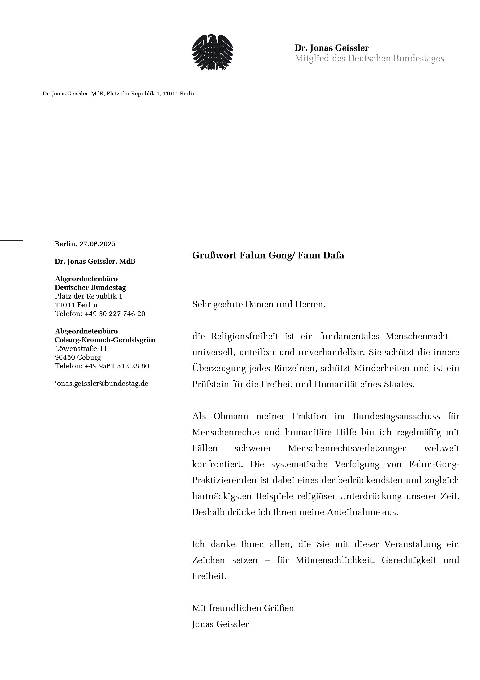 德國基社盟(CSU)聯邦議會議員、人權和人道主義援助委員會成員喬納斯﹒蓋斯勒博士(Dr. Jonas Geissler)發來聲援信如下: