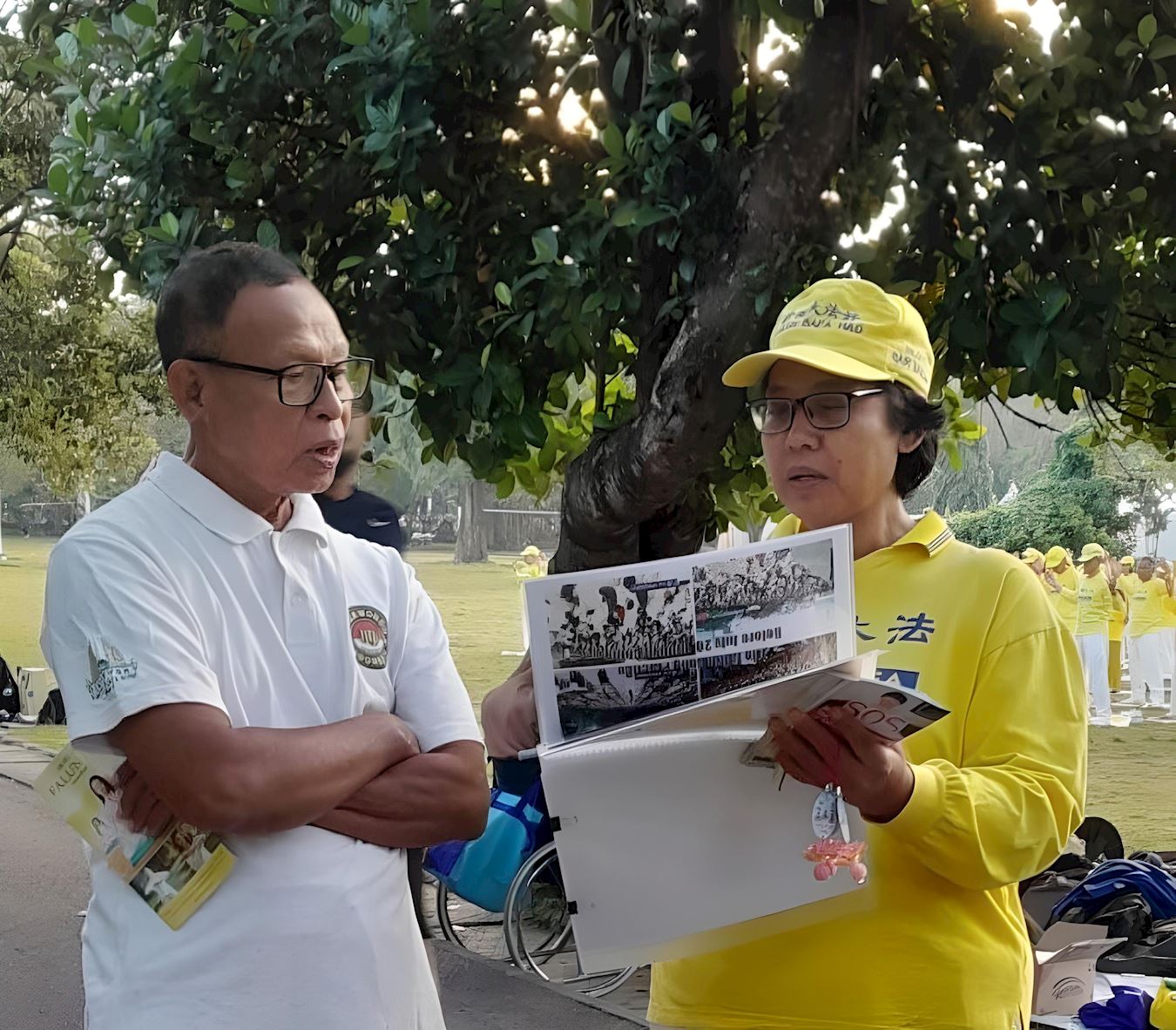 ![]() 圖11:法輪功學員正在向阿查(左二)講解真相。 |