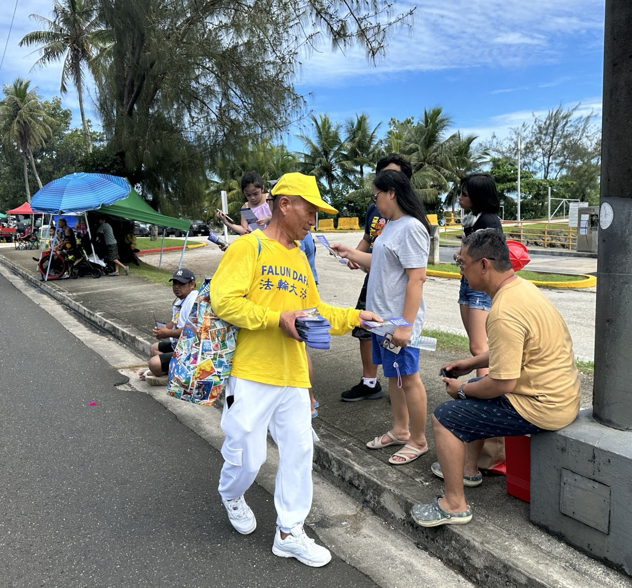 在關島查莫洛夜市,當地學員租用兩座西班牙傳統風格的亭子,且用醒目的各式橫幅、蓮花與看板布置得典雅別緻,吸引了許多遊客駐足觀看。來自台灣與日本的學員也利用空檔與當地學員一同向現場的有緣人介紹法輪功,分享修煉的美好與身心受益的經驗。天國樂團與腰鼓隊的表演吸引大量民眾觀賞,許多人在觀賞後主動前往攤位了解法輪大法的真相,甚至當場學煉功法。