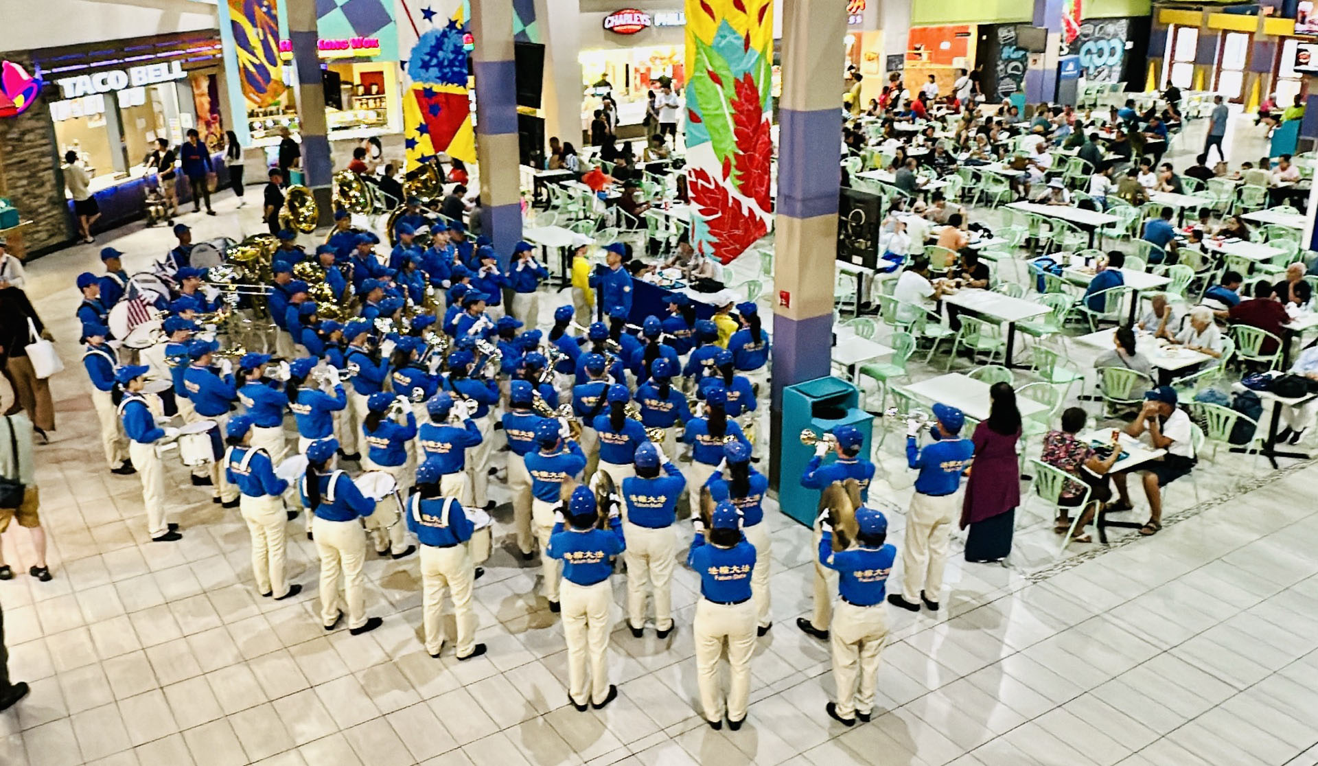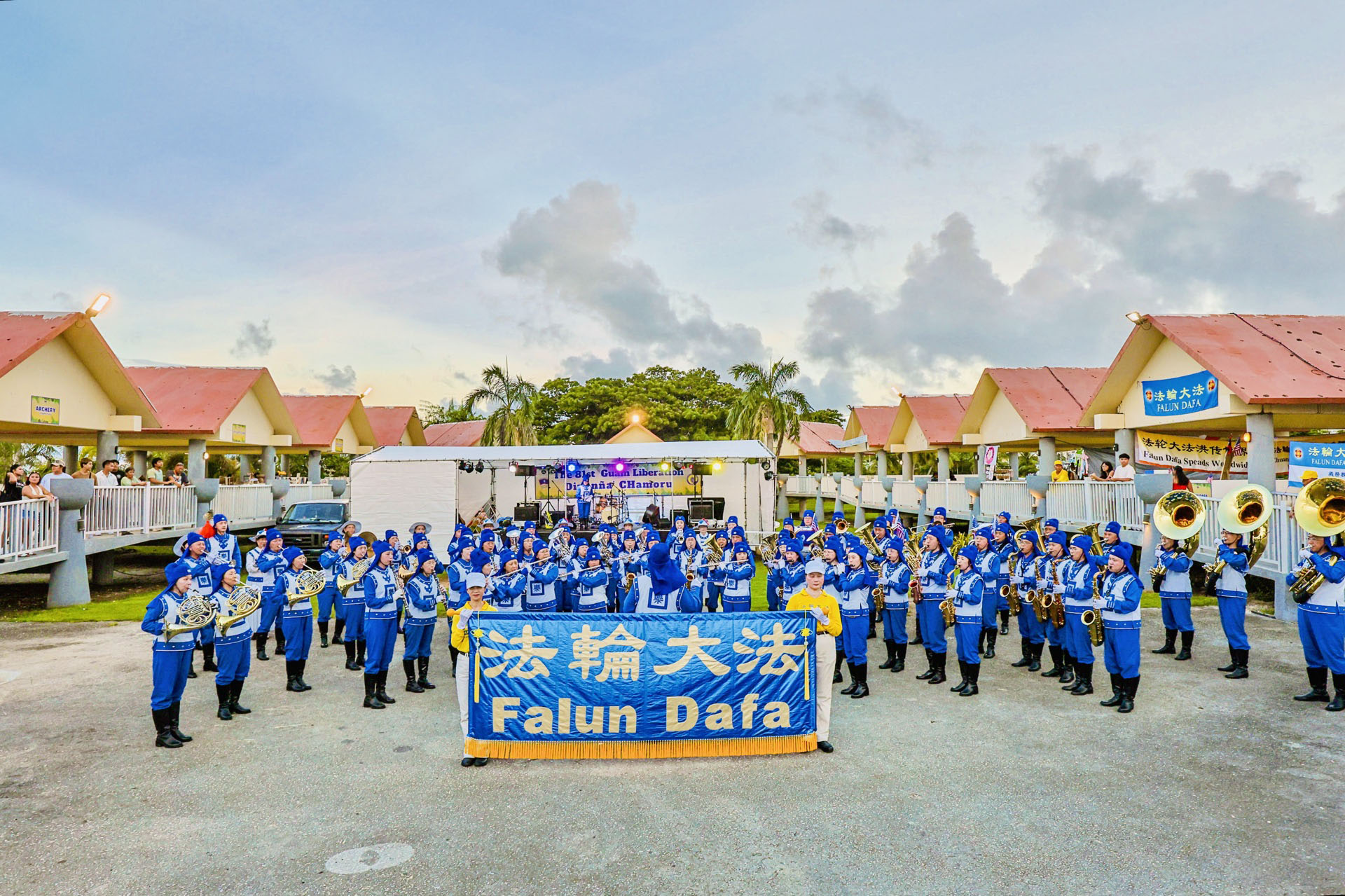 天國樂團遊行至觀禮台時,特別停下,面向司令台演奏了象徵美國精神的《星條旗永不落》進行曲,向關島總督、現場貴賓及民眾獻上誠摯的祝福。司令台上的總督及貴賓們也熱情揮手致意,表達對遠道而來的天國樂團的感謝與讚賞。此時,現場主持人也熱情介紹法輪大法與樂團背景。整體演出不僅展現藝術水準,更傳遞真、善、忍的精神理念,深受現場觀眾與媒體好評。此外,當地學員也上台分送法輪大法的簡介資料。