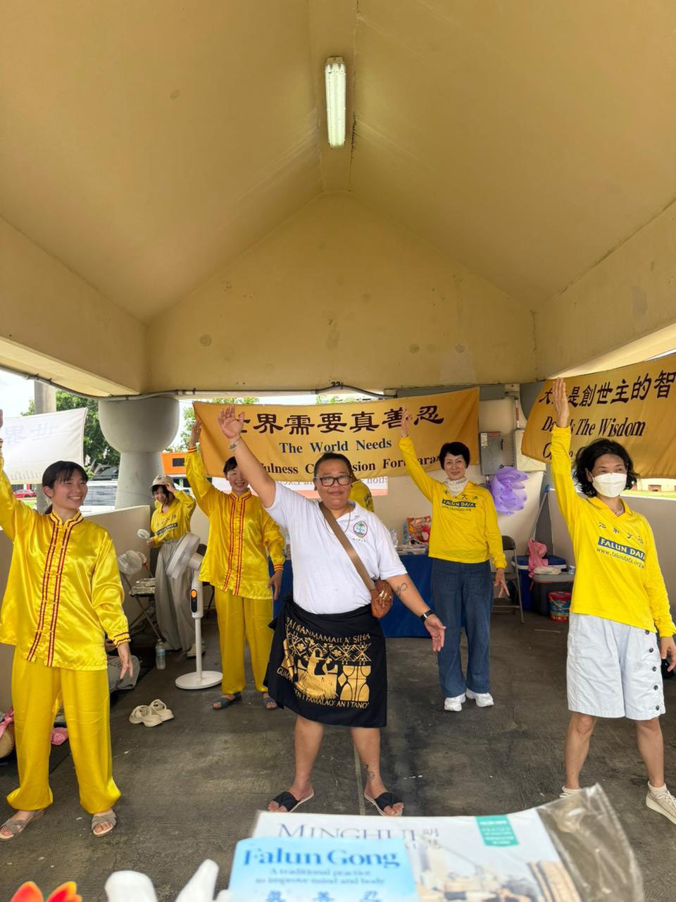 值得一提的是,七月二十二清晨,數十位來自台灣與日本法輪功學員在下榻飯店旁的馬塔潘海灘(Matapang Beach)公園煉功時,吸引了在附近的博克賽支架大洋舟俱樂部(Poksai Canoe Club)總教練娜塔莉(Natalie)的注意。