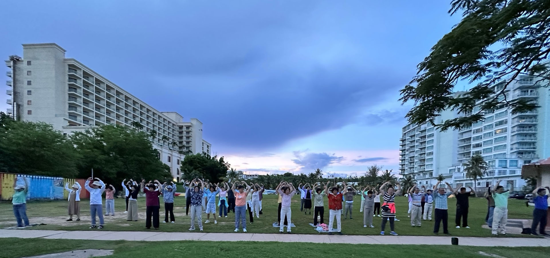 圖11:七月二十二清晨,數十位來自台灣與日本法輪功學員在馬塔潘海灘上的公園晨煉