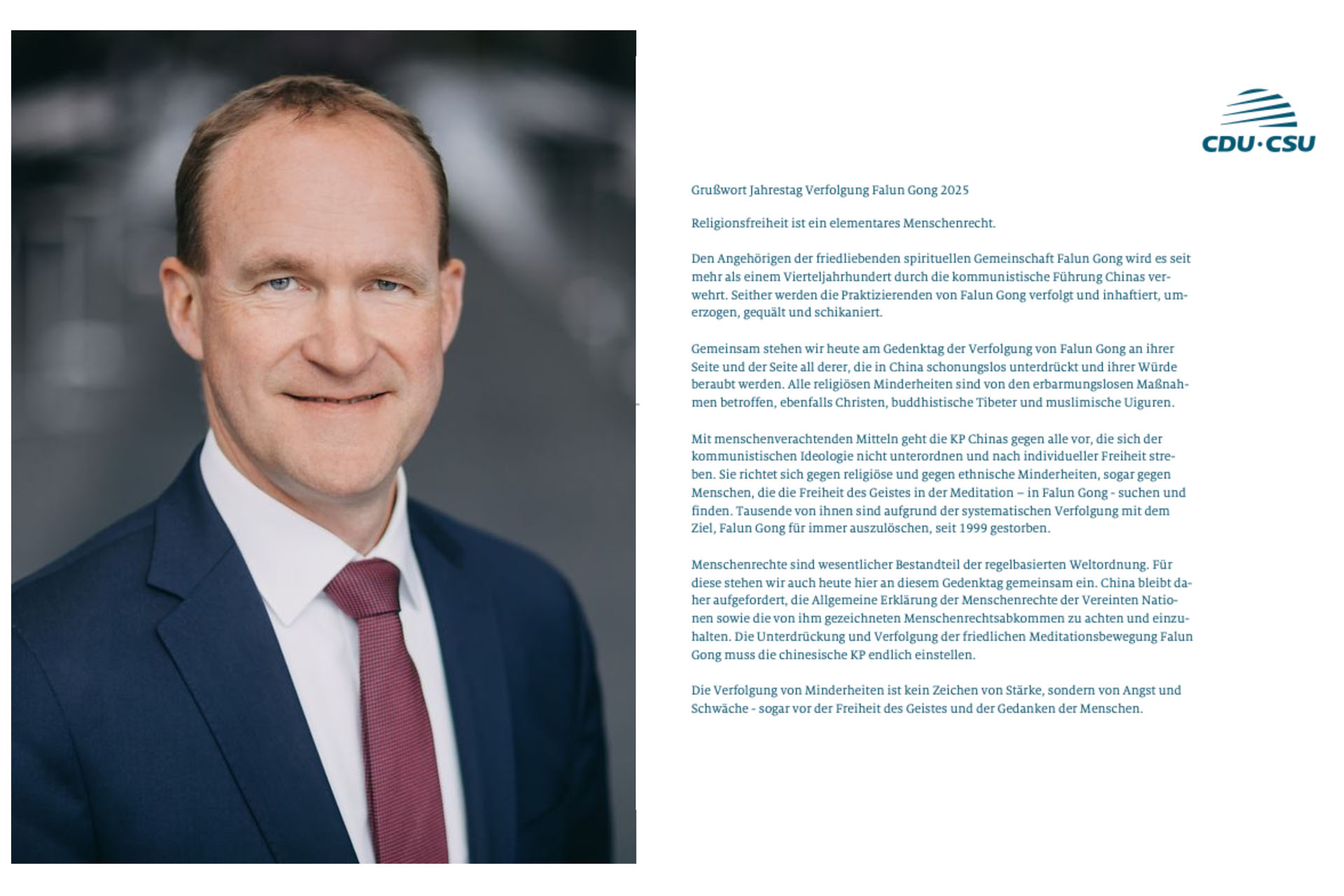 德國基民盟(CDU)聯邦議會議員、人權與人道主義援助委員會副主席諾伯特﹒阿爾滕坎普(Norbert Altenkamp)來函聲援。他說:「宗教自由是一項基本人權。然而,超過四分之一世紀以來,中共領導層一直剝奪和平精神團體法輪功的成員享有這項權利。自那時起,法輪功修煉者遭到迫害、監禁、強制洗腦、折磨與刁難。
