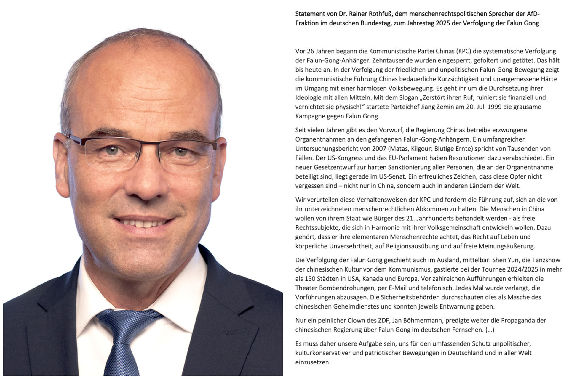 德國選擇黨(AfD)聯邦議會議員、選擇黨人權政策發言人萊納﹒羅特富斯博士(Dr. Rainer Rothfuß)來函聲援。