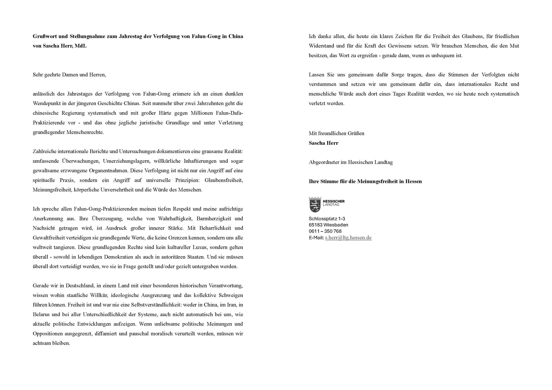 德國黑森州議會無黨派議員薩希阿﹒赫爾(Sascha Herr)來函聲援。