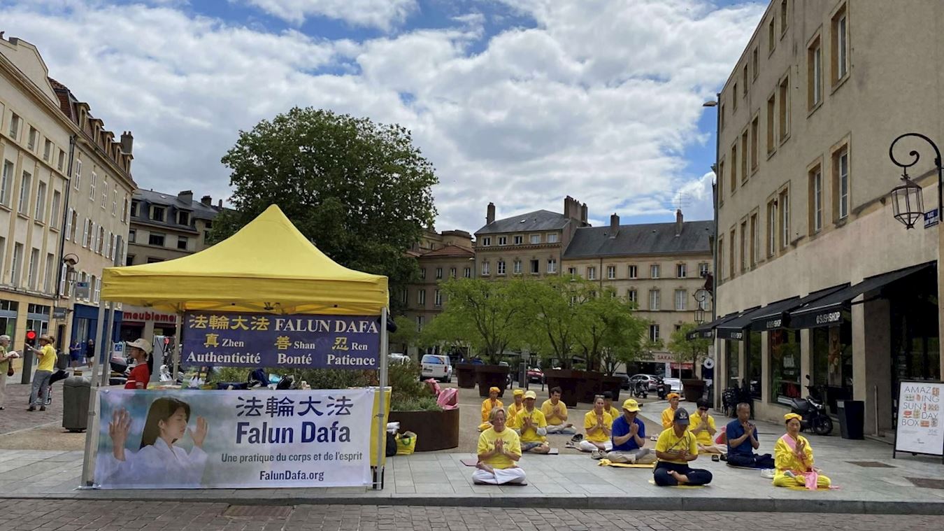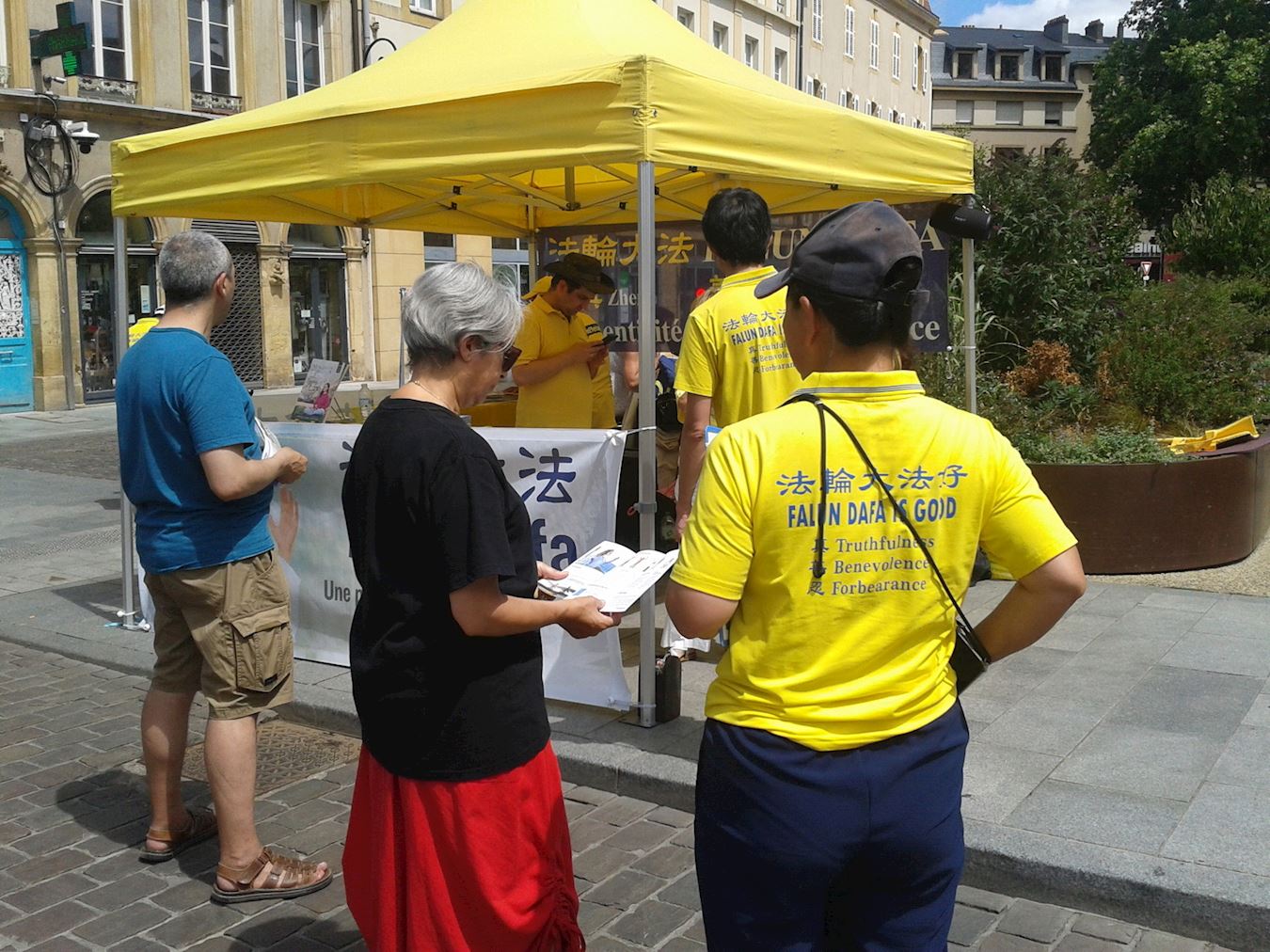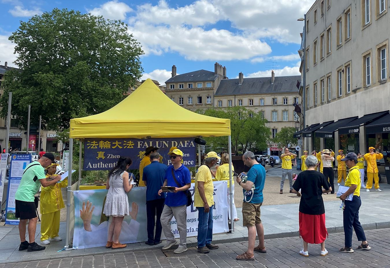 法輪功學員在梅斯市中心的聖路易廣場設置了信息台。他們的活動吸引了大量遊人和民眾。約有二十名當地居民表達了對修煉法輪功的興趣,並詢問了當地學員的聯繫方式,以及梅茲煉功點的地點和煉功時間。