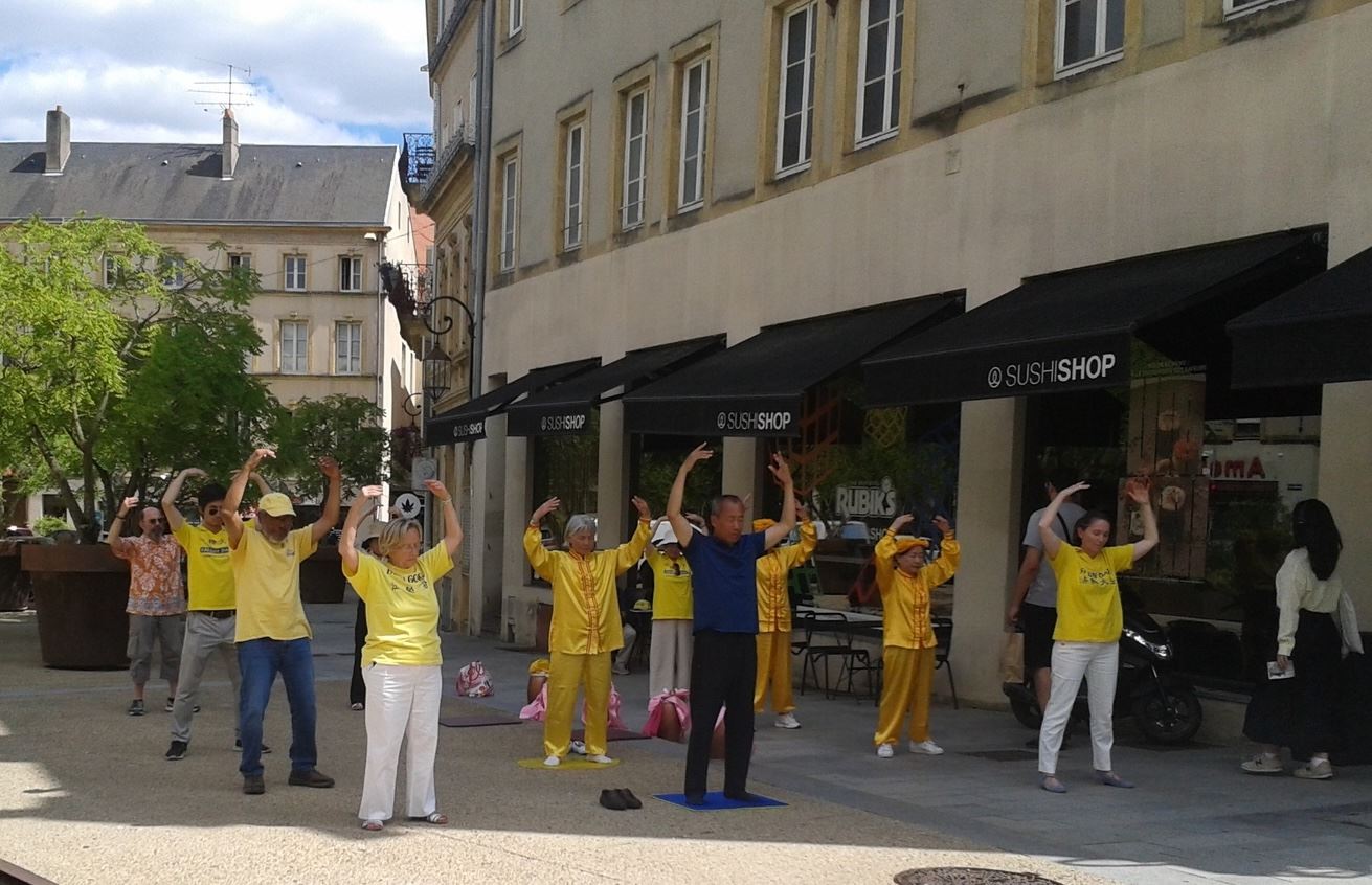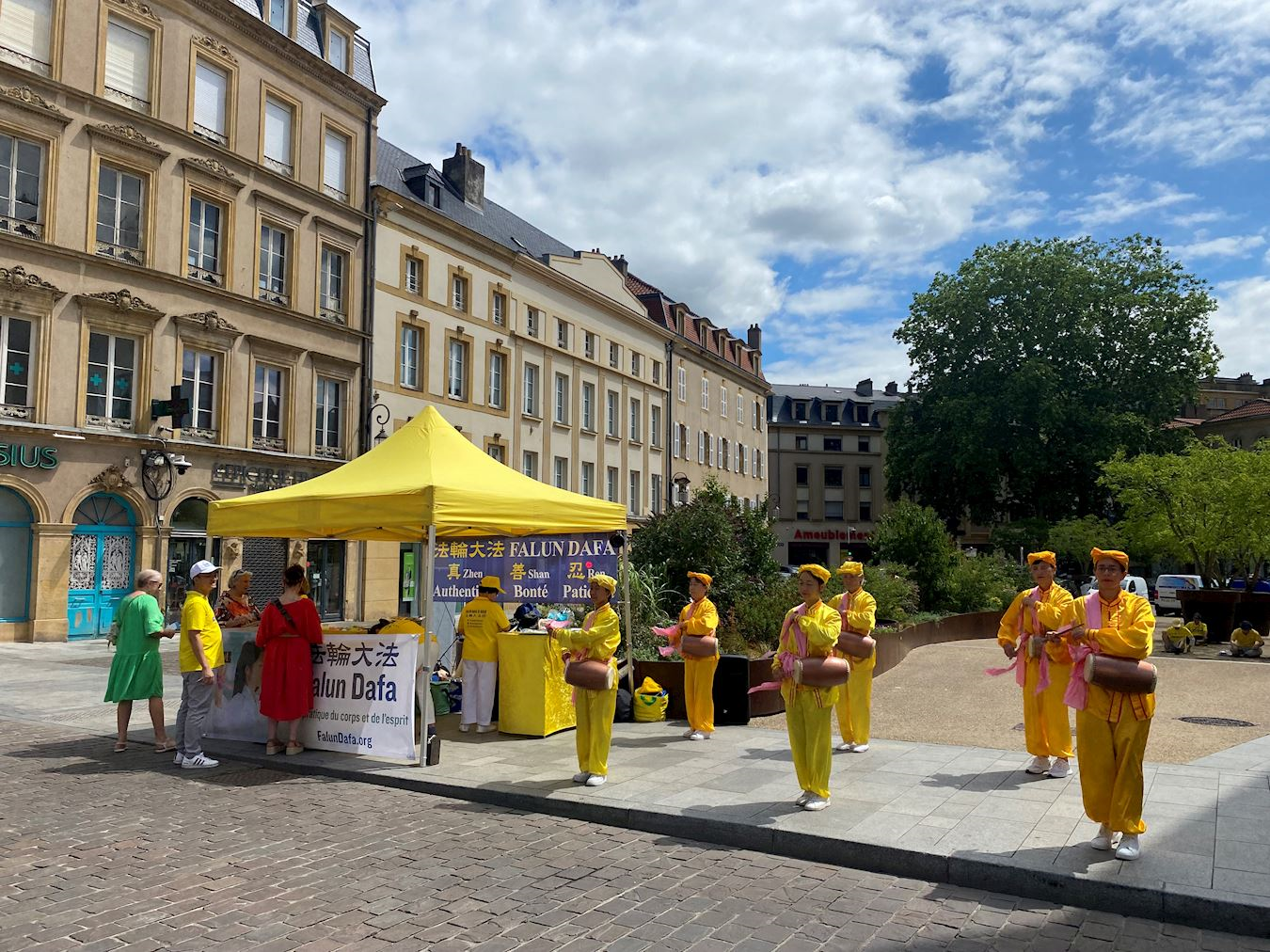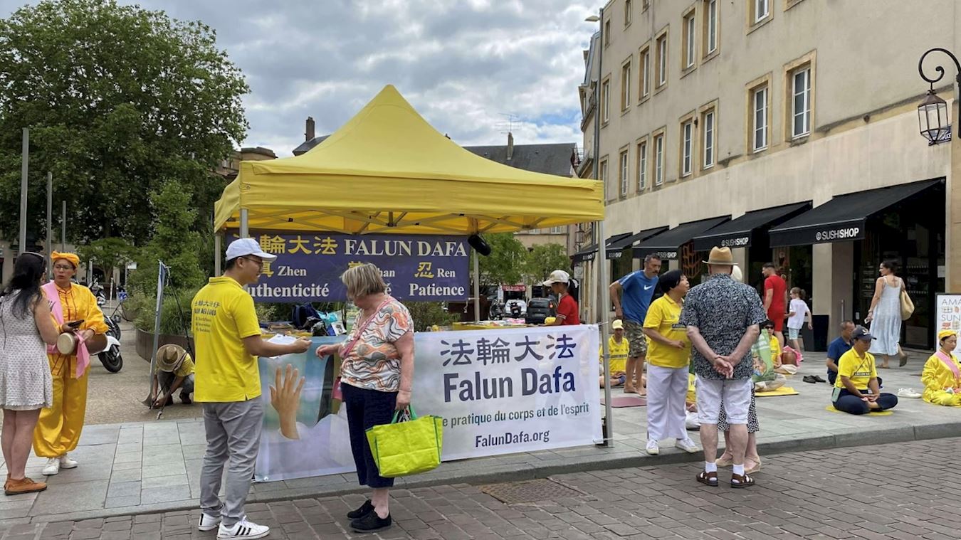 法輪功學員在梅斯市中心的聖路易廣場設置了信息台。他們的活動吸引了大量遊人和民眾。約有二十名當地居民表達了對修煉法輪功的興趣,並詢問了當地學員的聯繫方式,以及梅茲煉功點的地點和煉功時間。