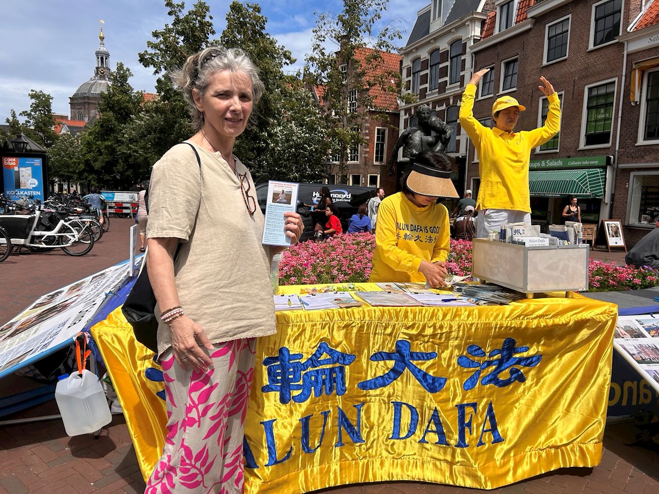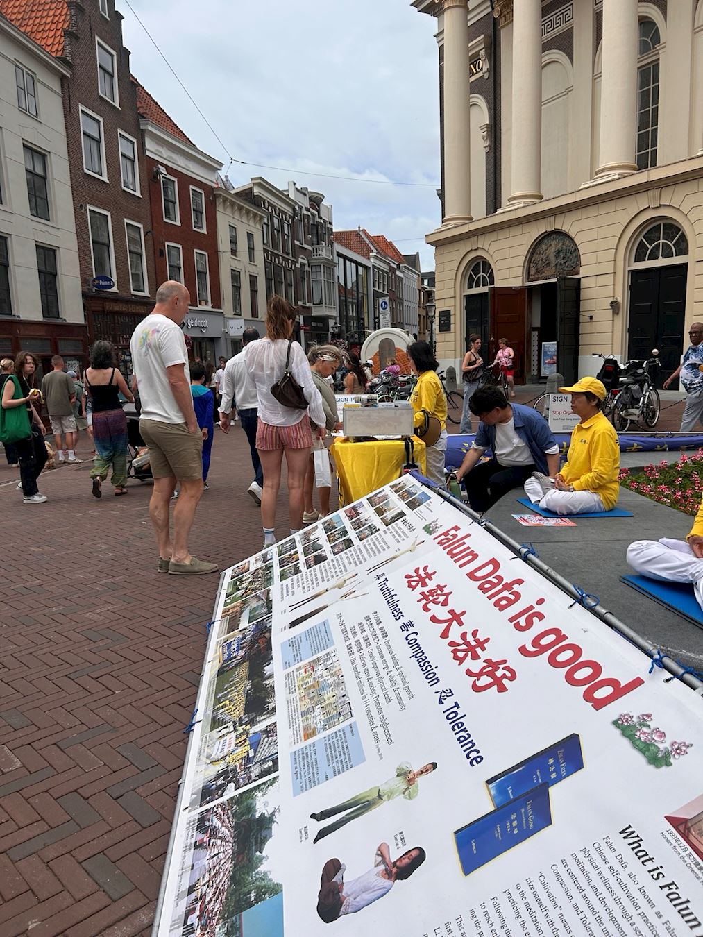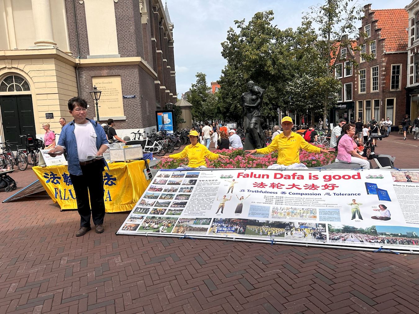 活動當天,學員們在萊頓市中心哈雷梅爾街(Haarlemmerstraat)布置「法輪大法弘傳世界」和「承受無名苦難 呼喚正義良知」兩塊展板,展示法輪功功法,發放傳單,向路人介紹法輪功真相,有來自中國大陸的移民感歎:「法輪功真了不起,經過這麼多年的(中共)鎮壓還屹立不倒!」