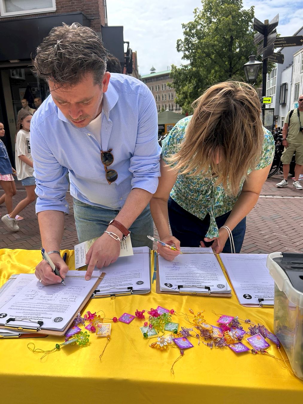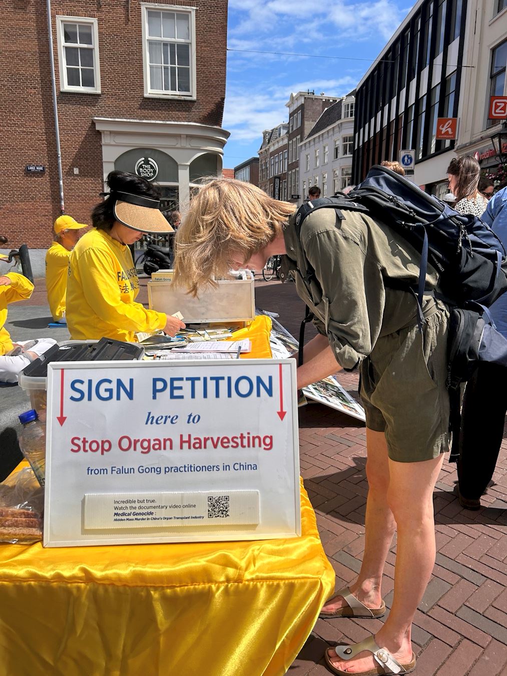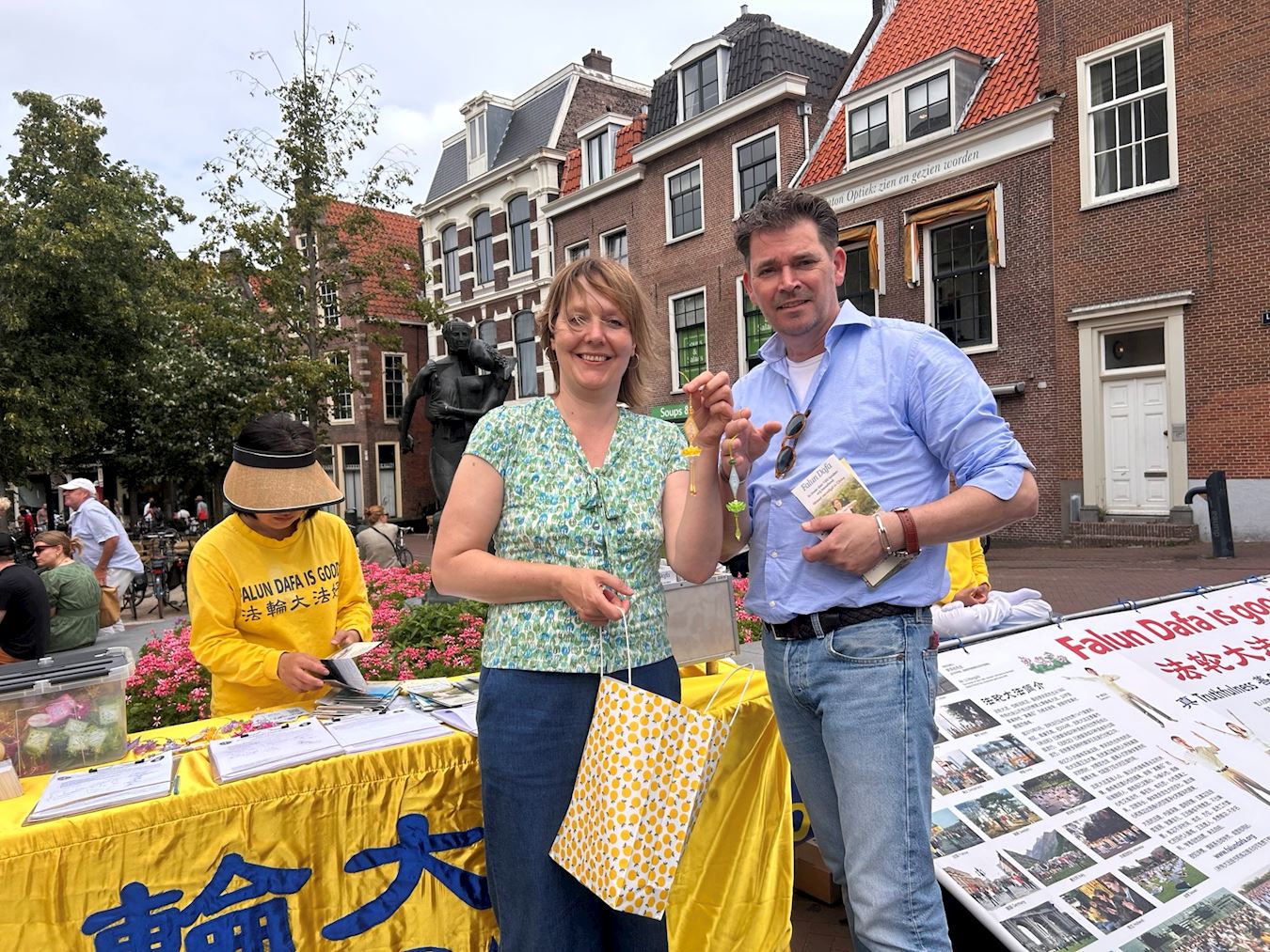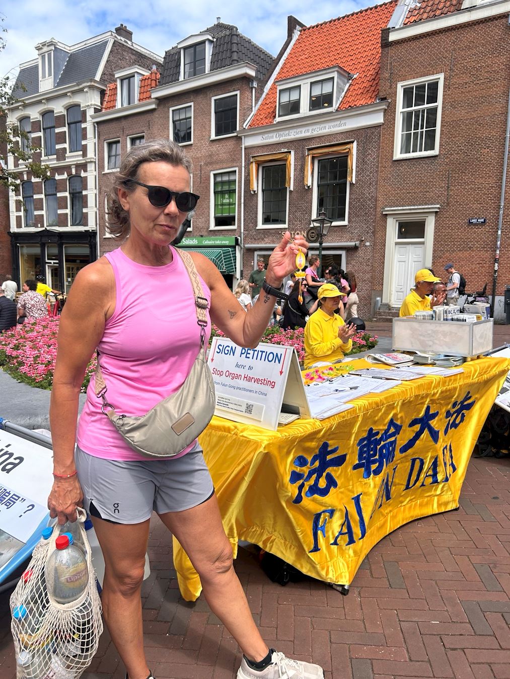 活動當天,學員們在萊頓市中心哈雷梅爾街(Haarlemmerstraat)布置「法輪大法弘傳世界」和「承受無名苦難 呼喚正義良知」兩塊展板,展示法輪功功法,發放傳單,向路人介紹法輪功真相,有來自中國大陸的移民感歎:「法輪功真了不起,經過這麼多年的(中共)鎮壓還屹立不倒!」