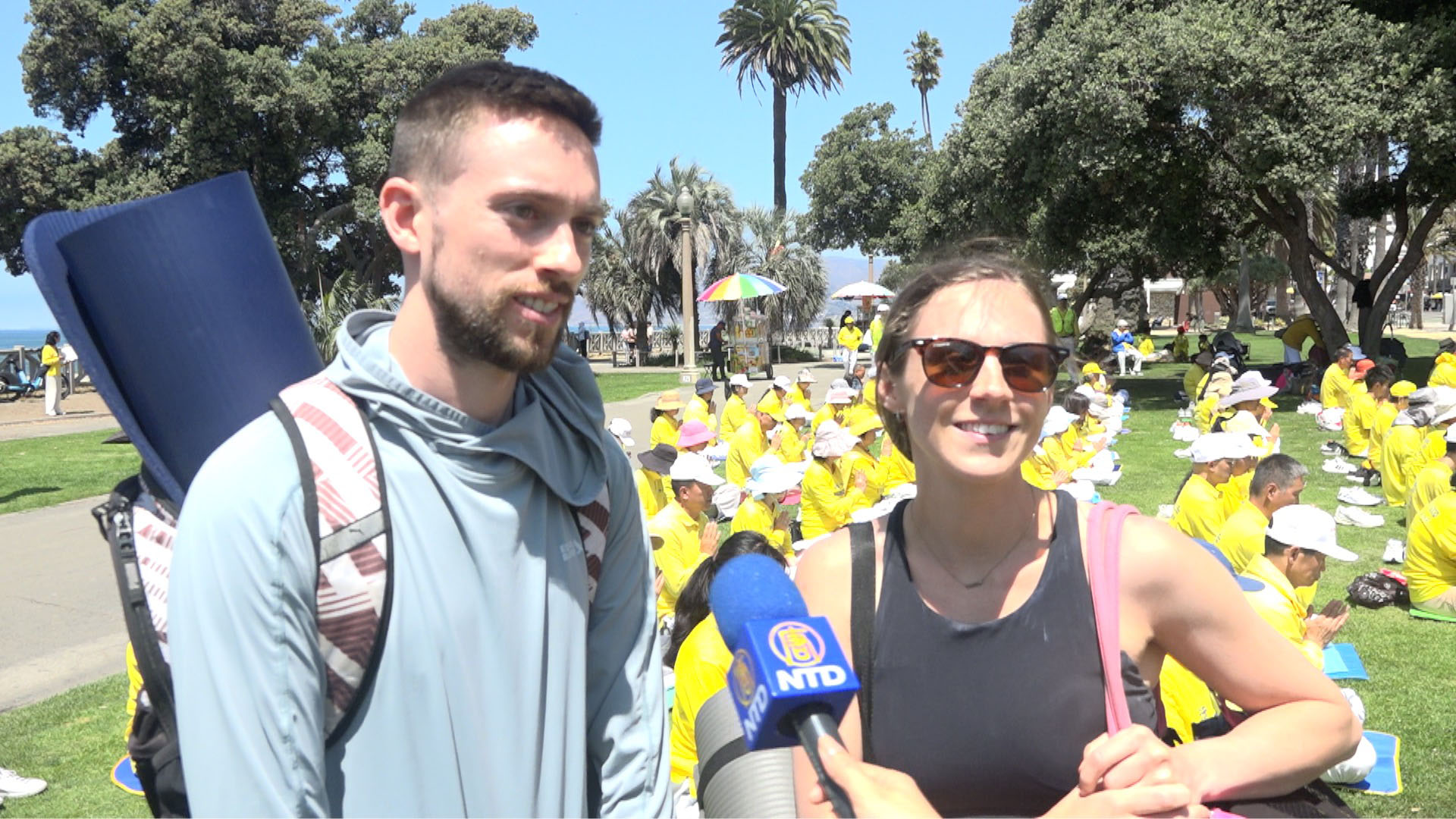 住在附近的居民布倫丹﹒克拉克(Brendan Clarke)介紹,他們事先上網了解了法輪功後,來到現場學煉功法,「煉完後感覺很棒,讓人平靜,我很喜歡,而且這裏的每個人都很友善。」一起學煉的傑西﹒波特(Jesse Porter)也說:「感覺非常輕鬆祥和。」兩人都表示,這樣美好的修煉方法應該廣傳。所以他們很支持美國政府發出正義聲音,制止中共對法輪功的迫害。