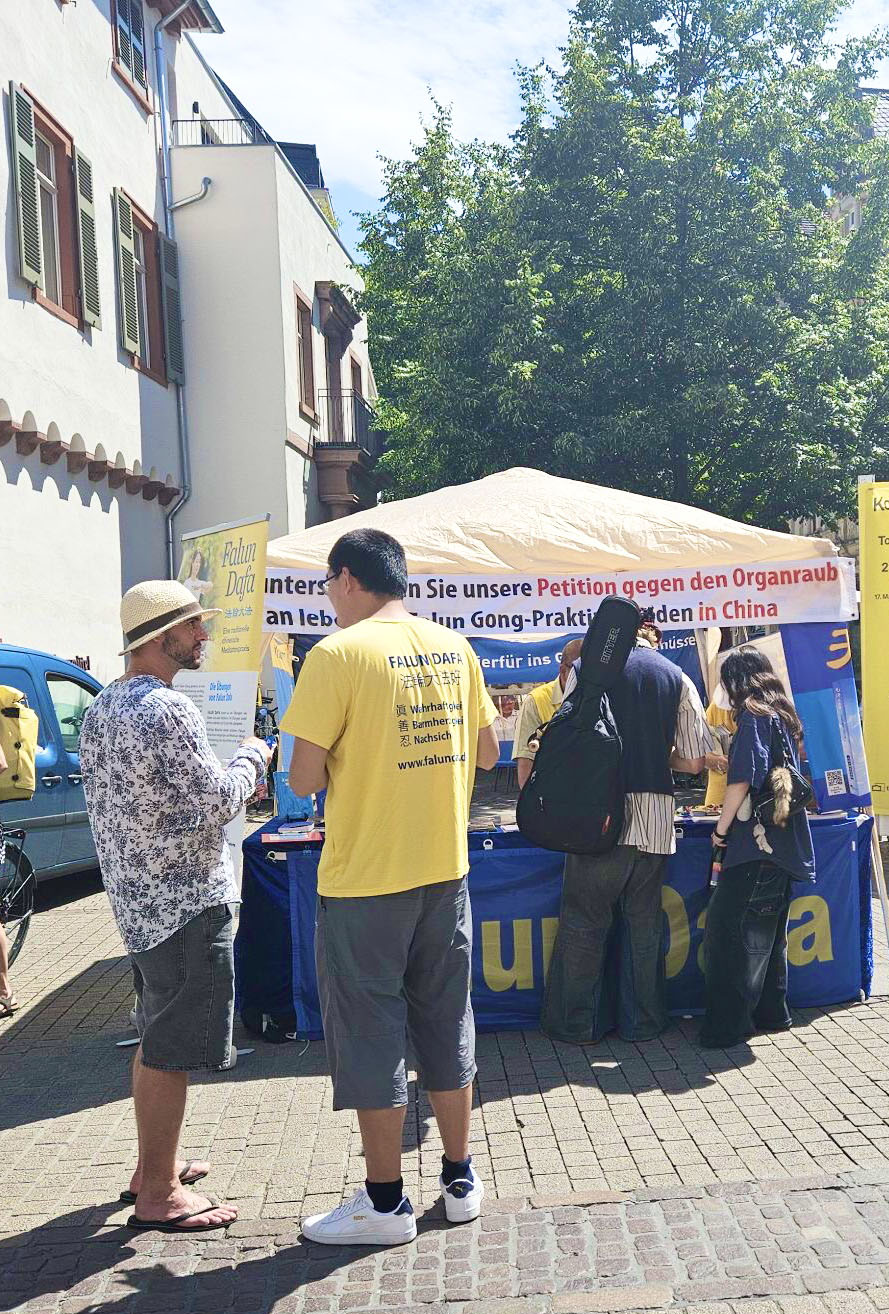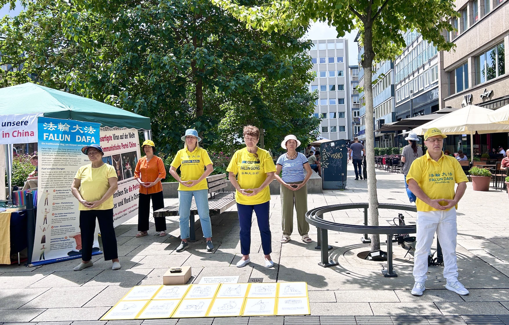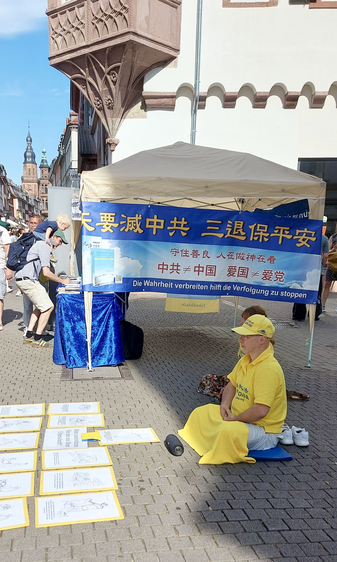 ![]() 圖1:二零二五年七月五日, 德國法輪功學員在海德堡劇院廣場(Theaterplatz)徵簽反迫害。圖為法輪功學員在煉功。 |