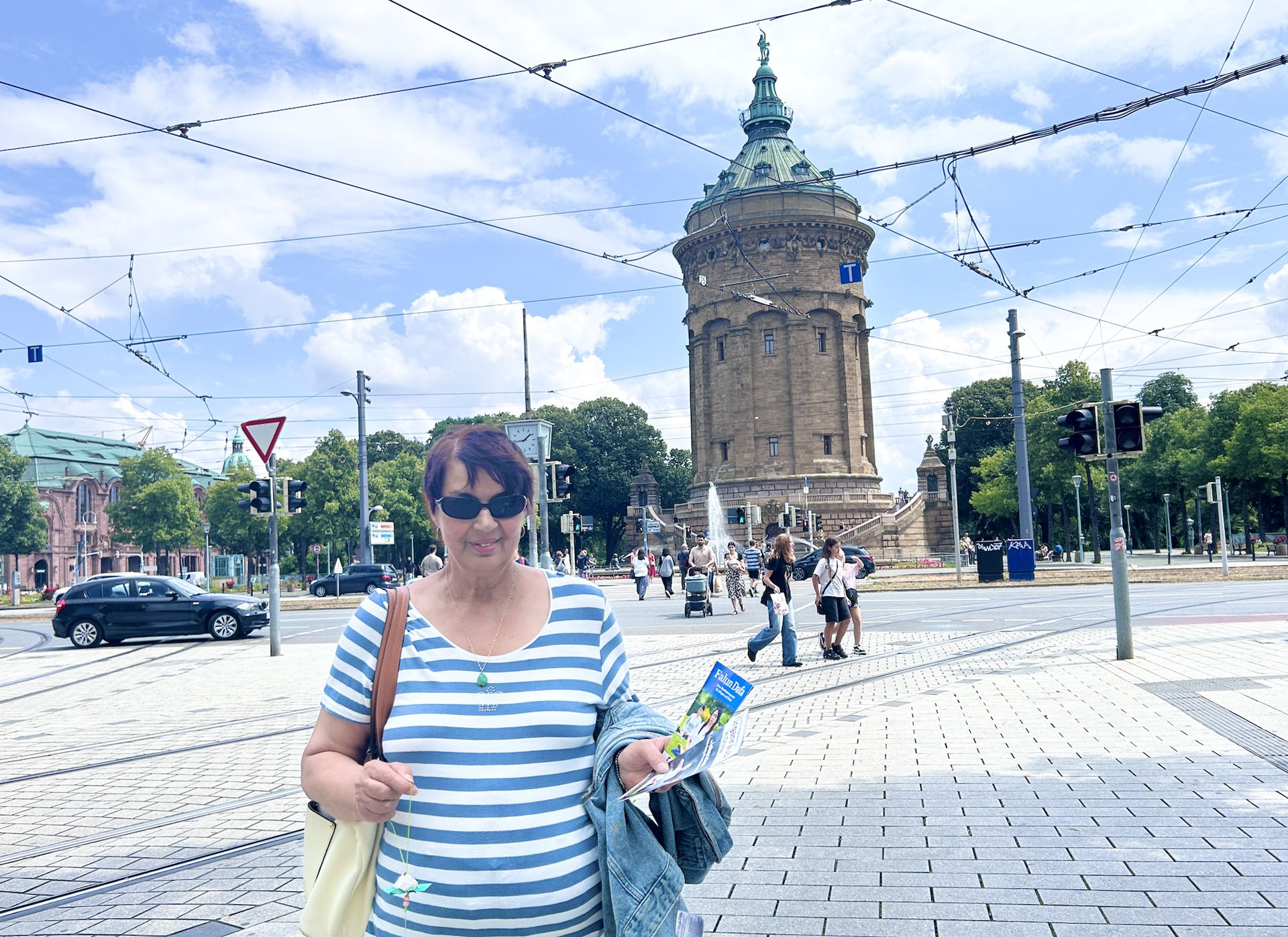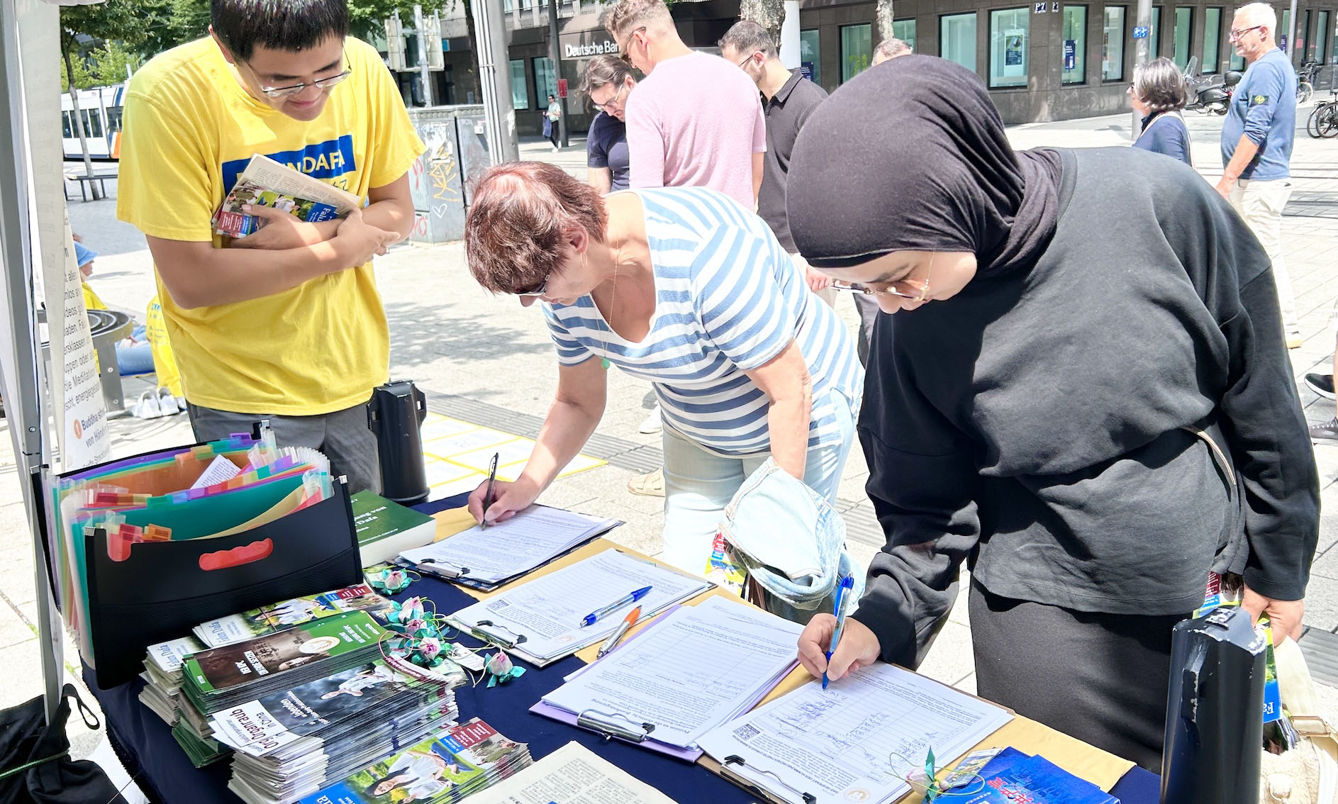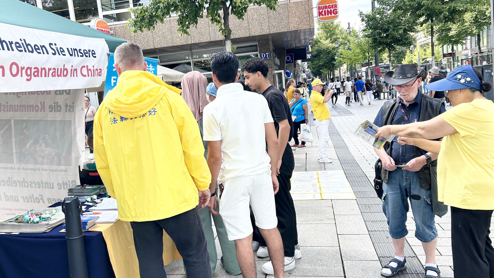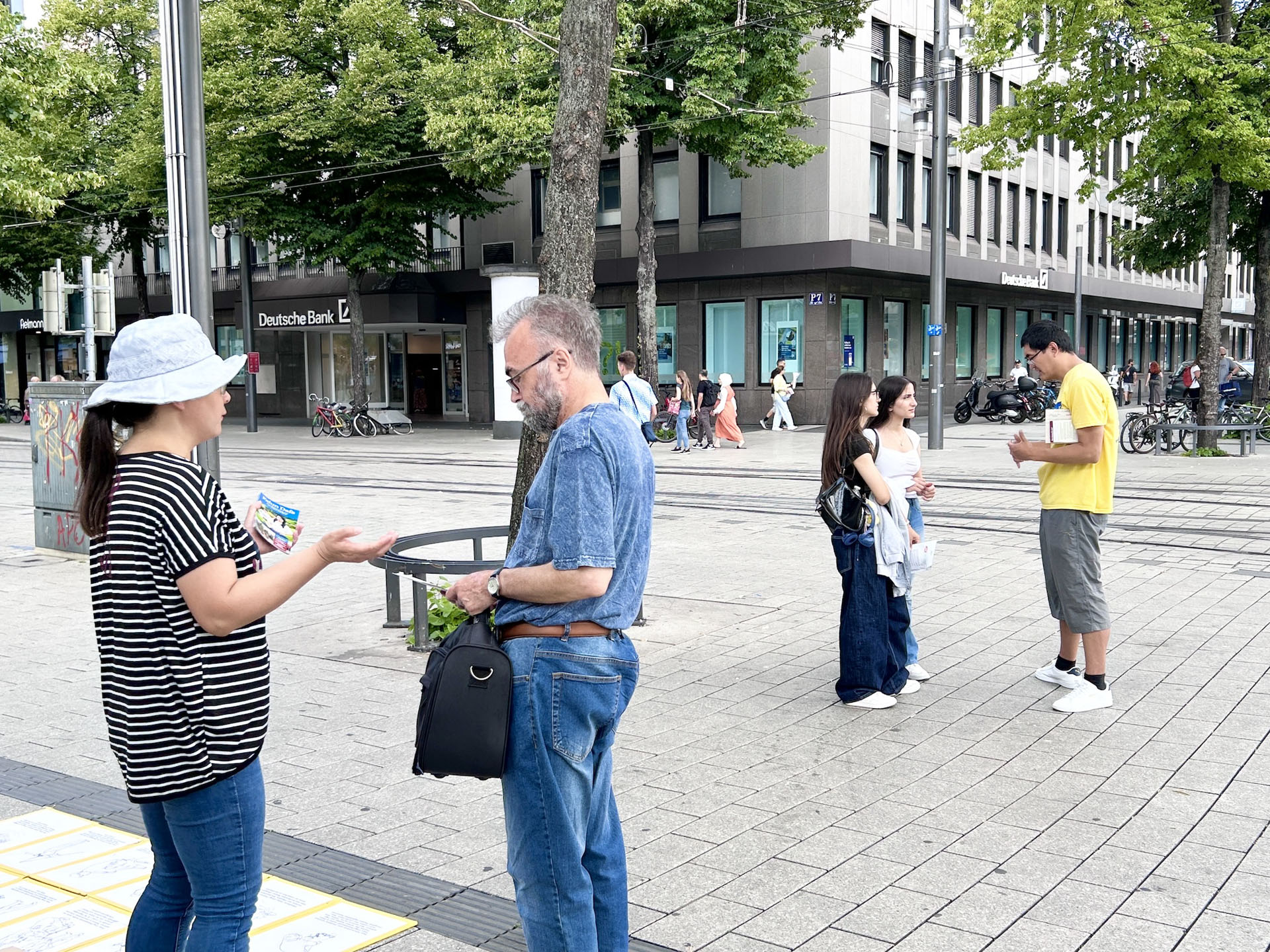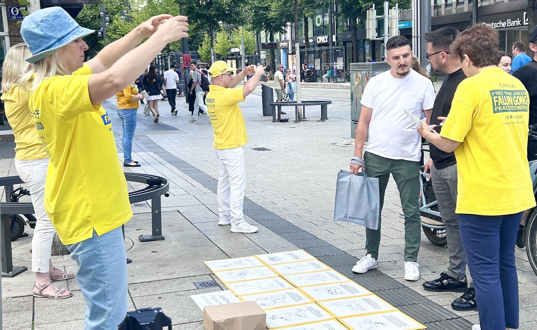 ![]() 圖2:二零二五年七月二十六日, 德國法輪功學員在曼海姆水塔(Wasserturm)對面步行街弘法,反迫害。圖為學員在向路人演示功法。 |