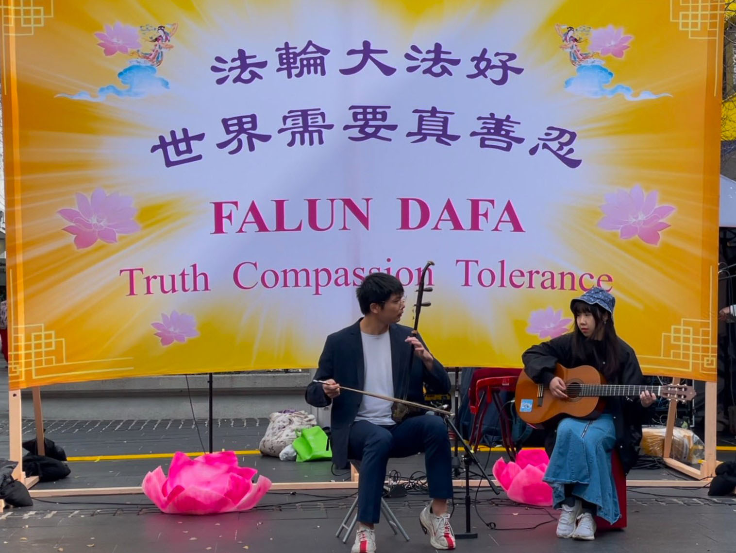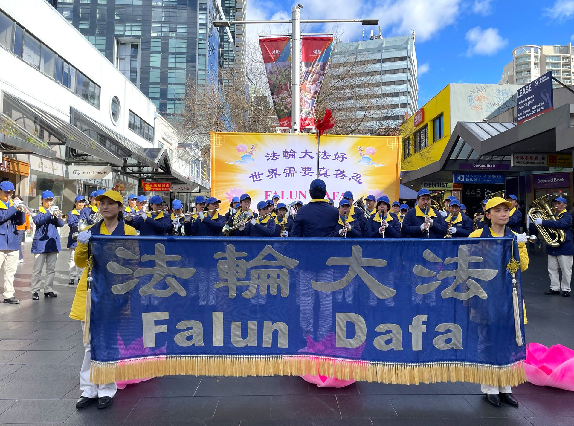 圖1:由法輪功學員組成的天國樂團在查茨伍德鎮主街為活動開幕奏響