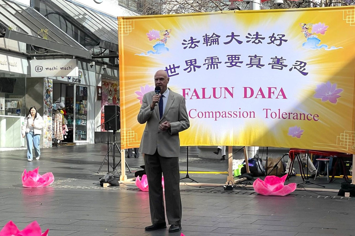 法輪大法澳洲佛學會發言人戴樂(John Deller)在演講中表示歡迎查茨伍德的居民參加此活動,並說這是慶祝和紀念法輪大法弘傳世界的日子。