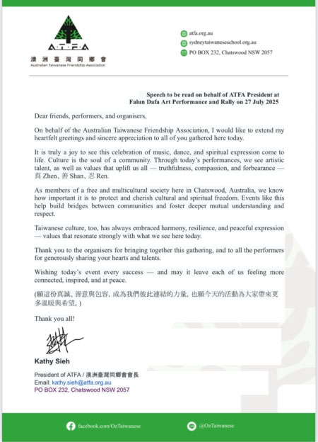 澳洲台灣友誼協會謝會長(Kathy Sieh)在信中寫道:「代表澳大利亞台灣友誼協會,我謹向今天在此聚會的各位致以誠摯的問候和衷心的感謝。」