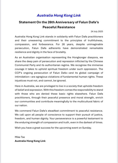 澳港聯給活動發來聲援信函表示:「澳大利亞香港聯誼會與法輪功學員站在一起,支持他們對真、善、忍原理的堅定承諾。二十六年來,儘管面臨難以想像的迫害,法輪功學員在面對暴行時展現了非凡的韌性和尊嚴。」