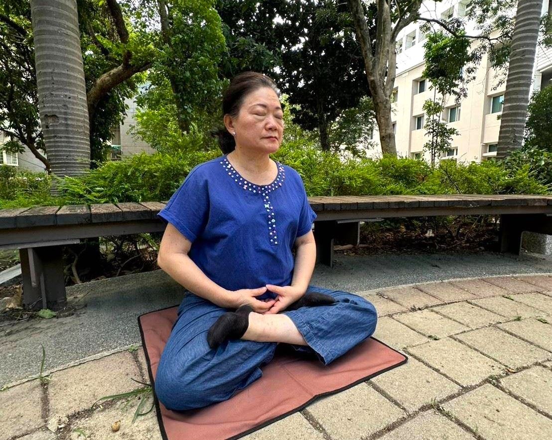'圖2:曼娜正在煉法輪功第五套功法──神通加持法。'