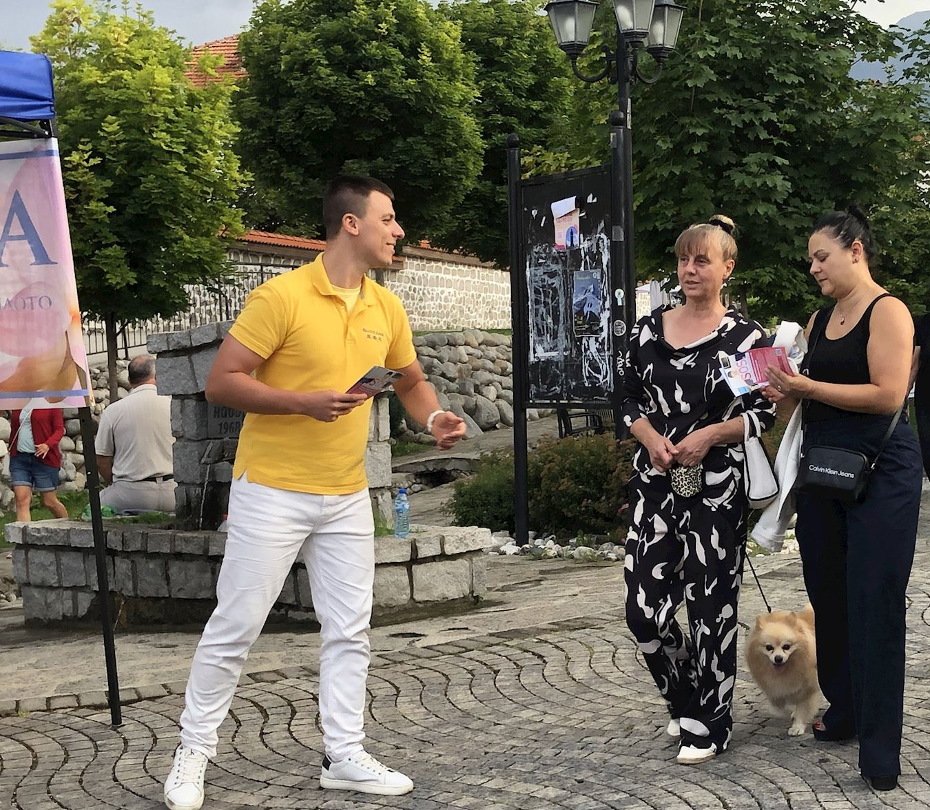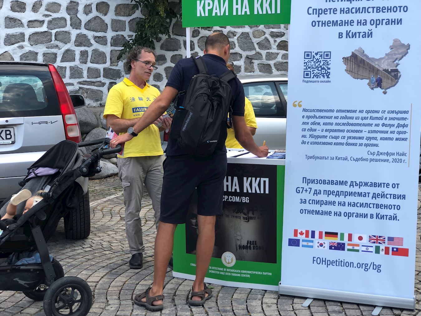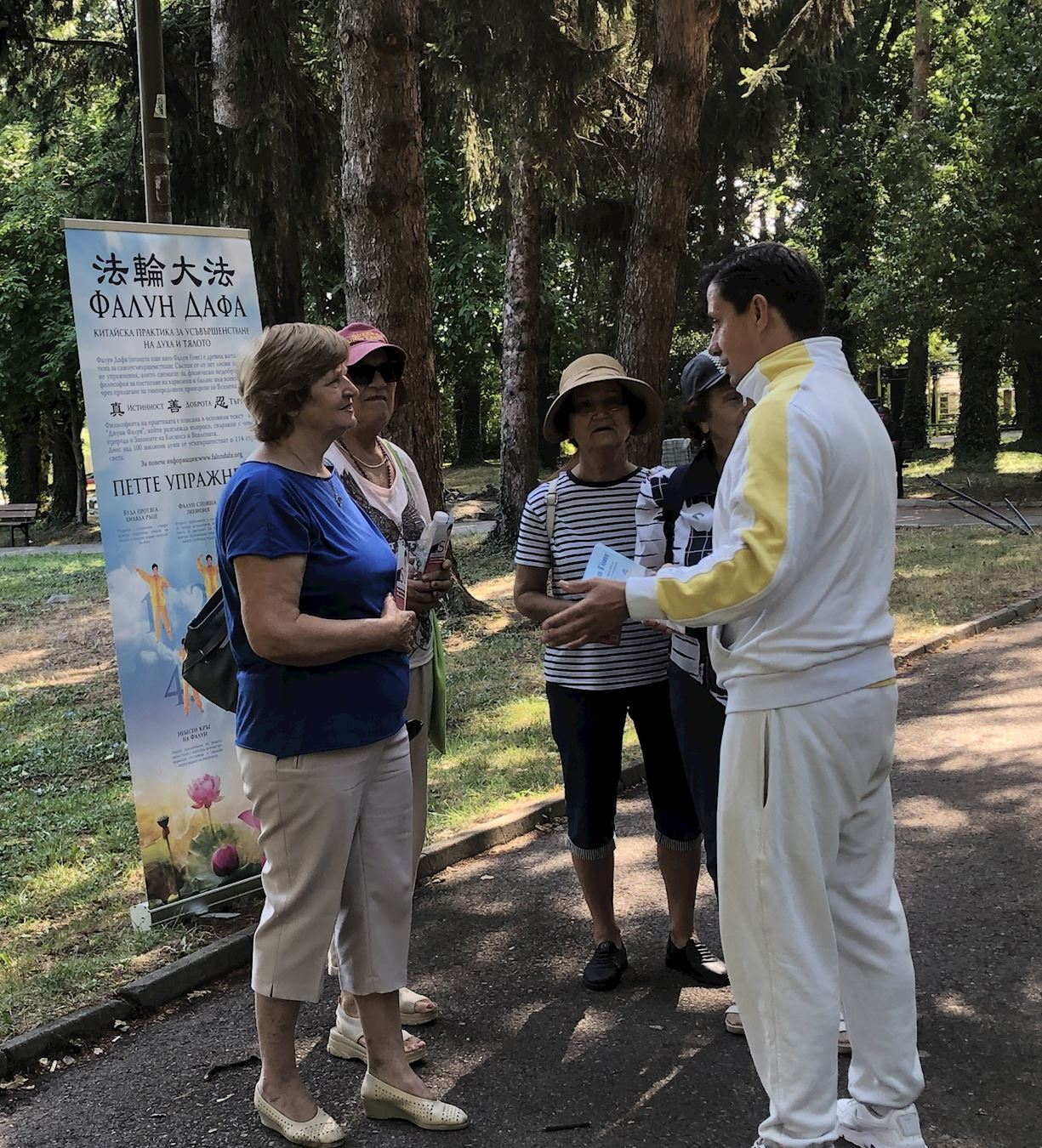 八月二日至三日,學員們在班斯科中央公園集體煉功,並向路人分發傳單。八月二日下午,學員們在戈策﹒德爾切夫紀念碑(Monument of Goce Delchev)前設置信息台,向民眾介紹法輪功真相,同時展示五套功法。許多人得知中共對善良的修煉人強制摘取器官的事實後,紛紛在請願書上簽名。