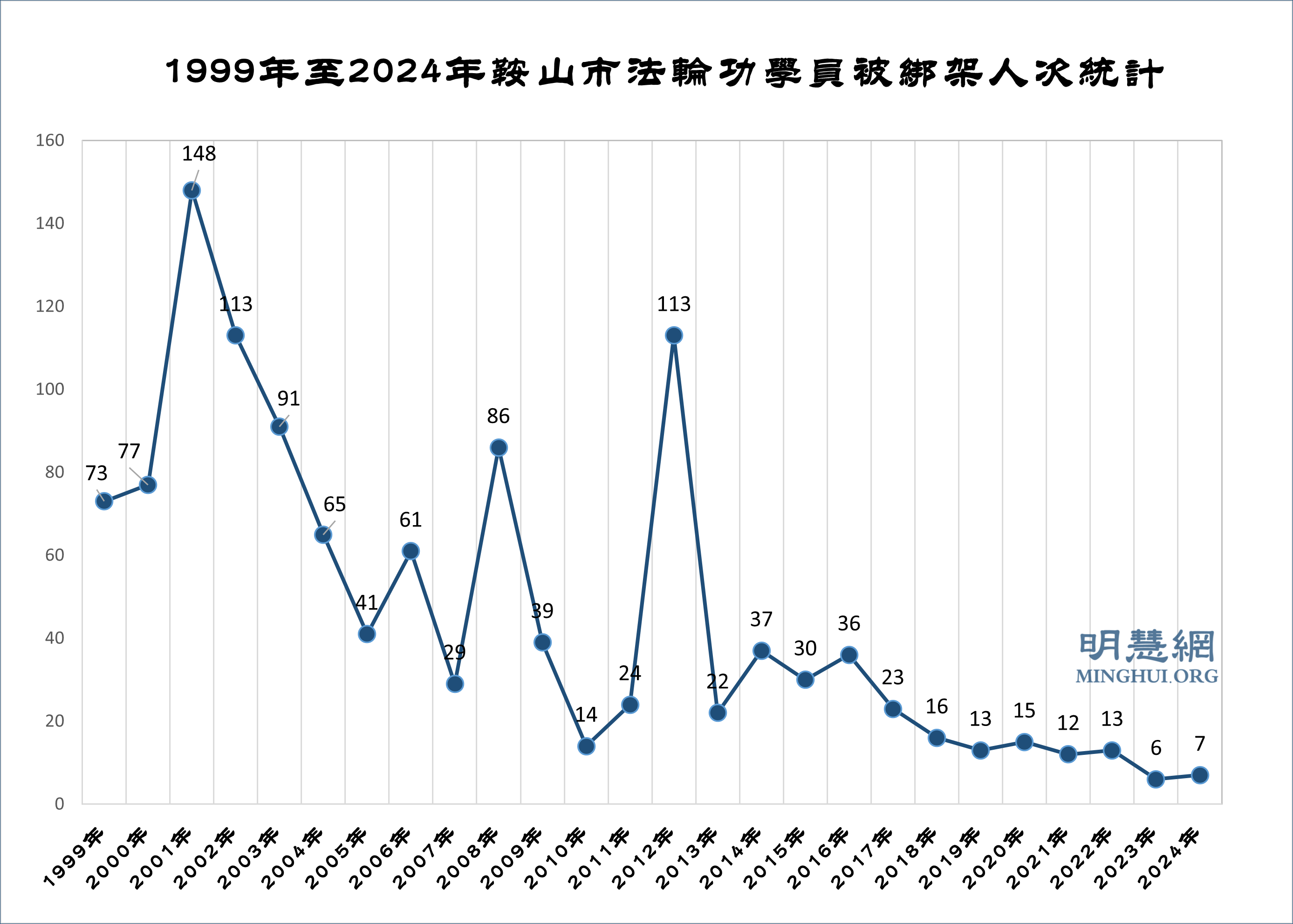 ![]() 圖1:1999年至2024年鞍山市法輪功學員被綁架人次統計 |