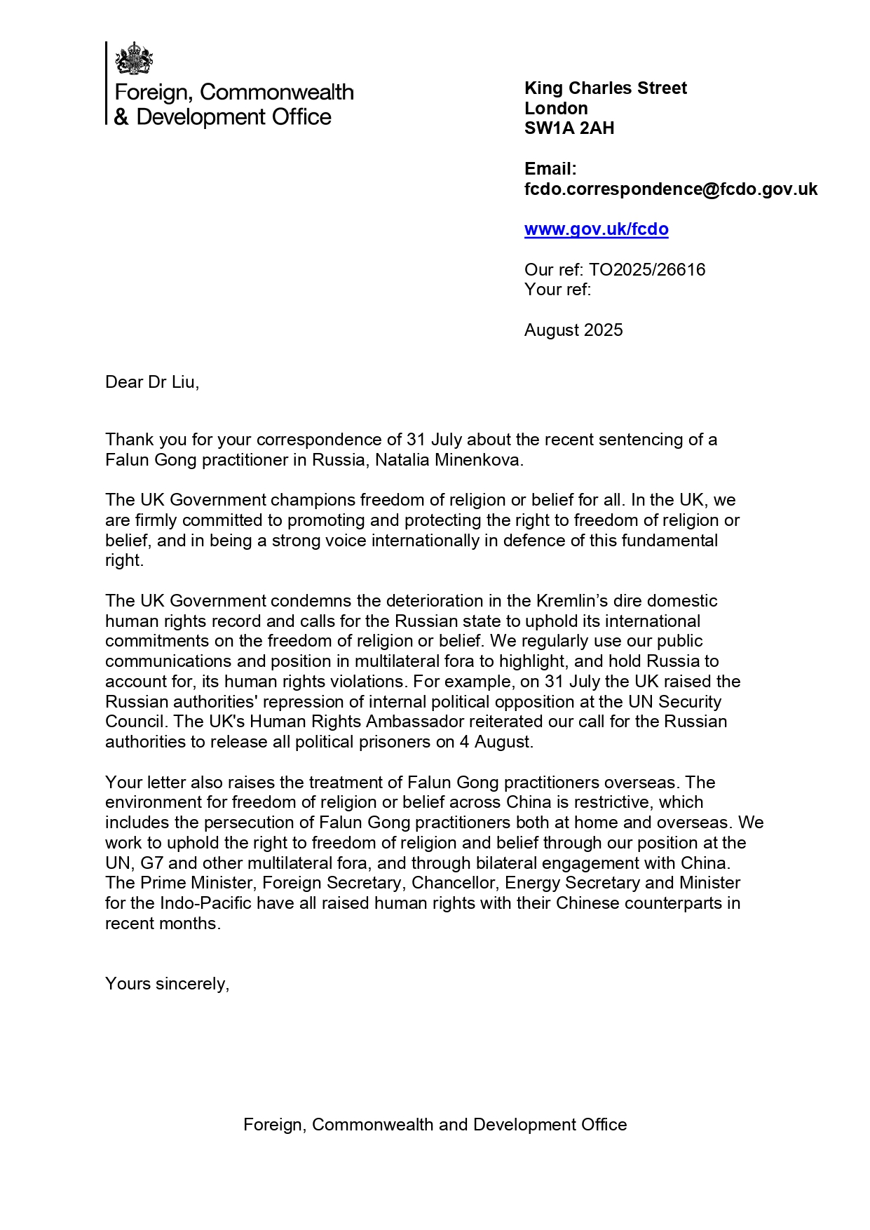 ![]() 圖1:二零二五年八月十五日,英國外交部回信英國法輪大法學會。 |