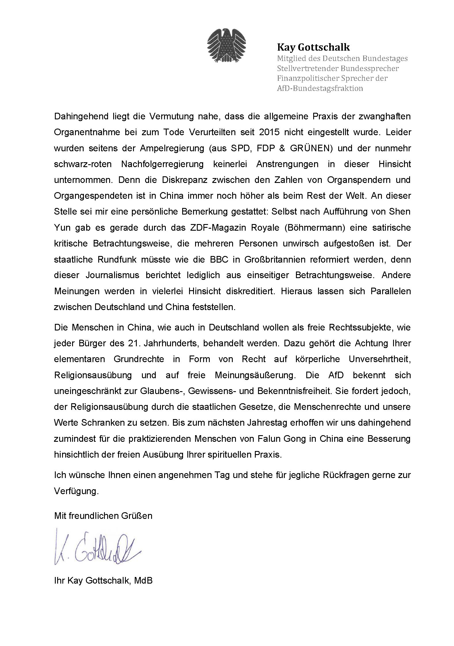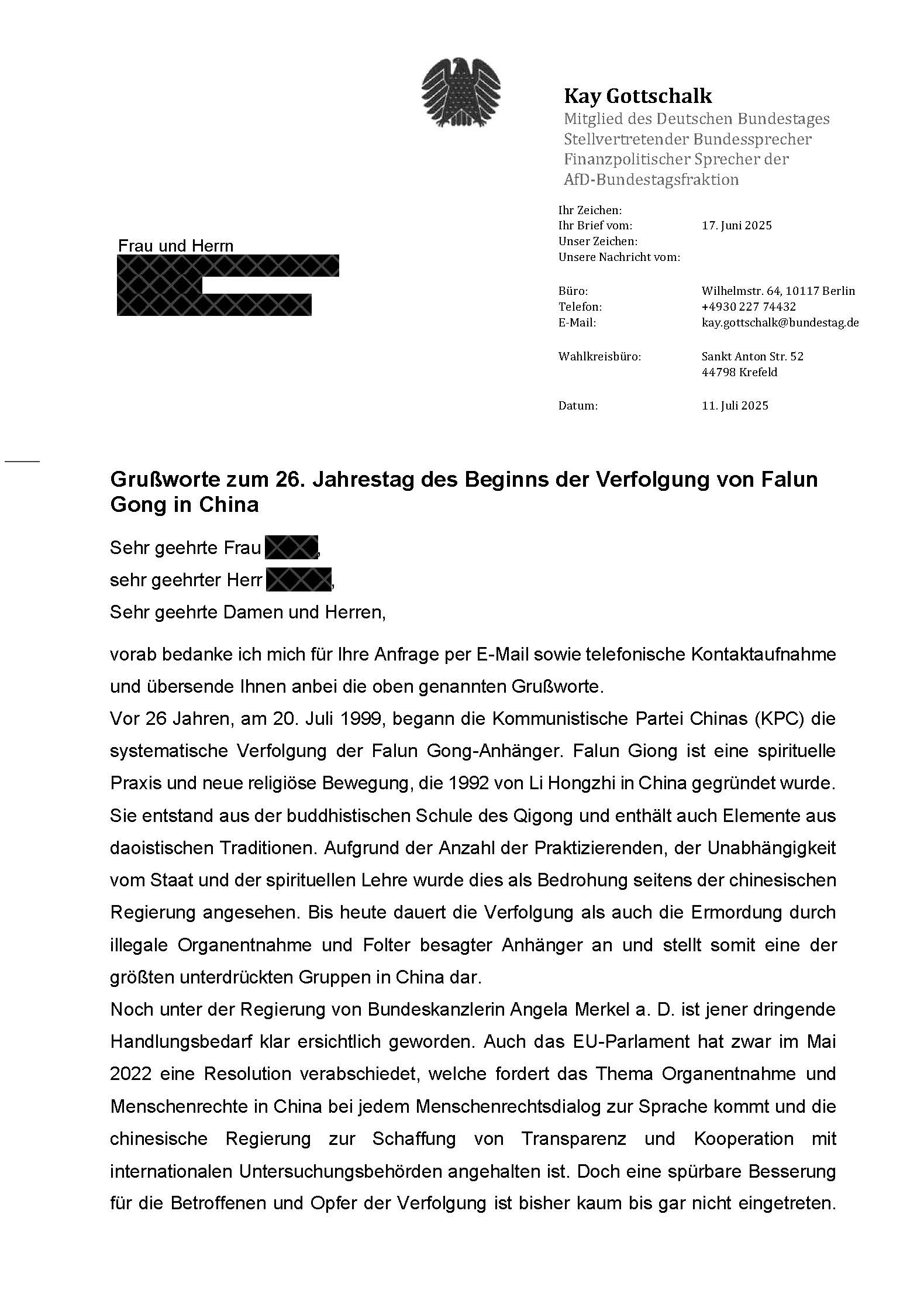 【明慧網二零二五年八月十八日】(明慧德國記者站報導)德國聯邦議員、聯邦副發言人、選項黨(AfD)聯邦議會社團財政政策發言人凱﹒戈特沙爾克(Kay Gottschalk, MdB)最近給法輪功學員來函,聲援法輪功學員反迫害,譴責中共迫害和非法活摘法輪功學員器官,並批評了德國電視二台《皇家》節目(ZDF-Magazin Royale)主持人博默曼(Böhmermann))對神韻的攻擊。