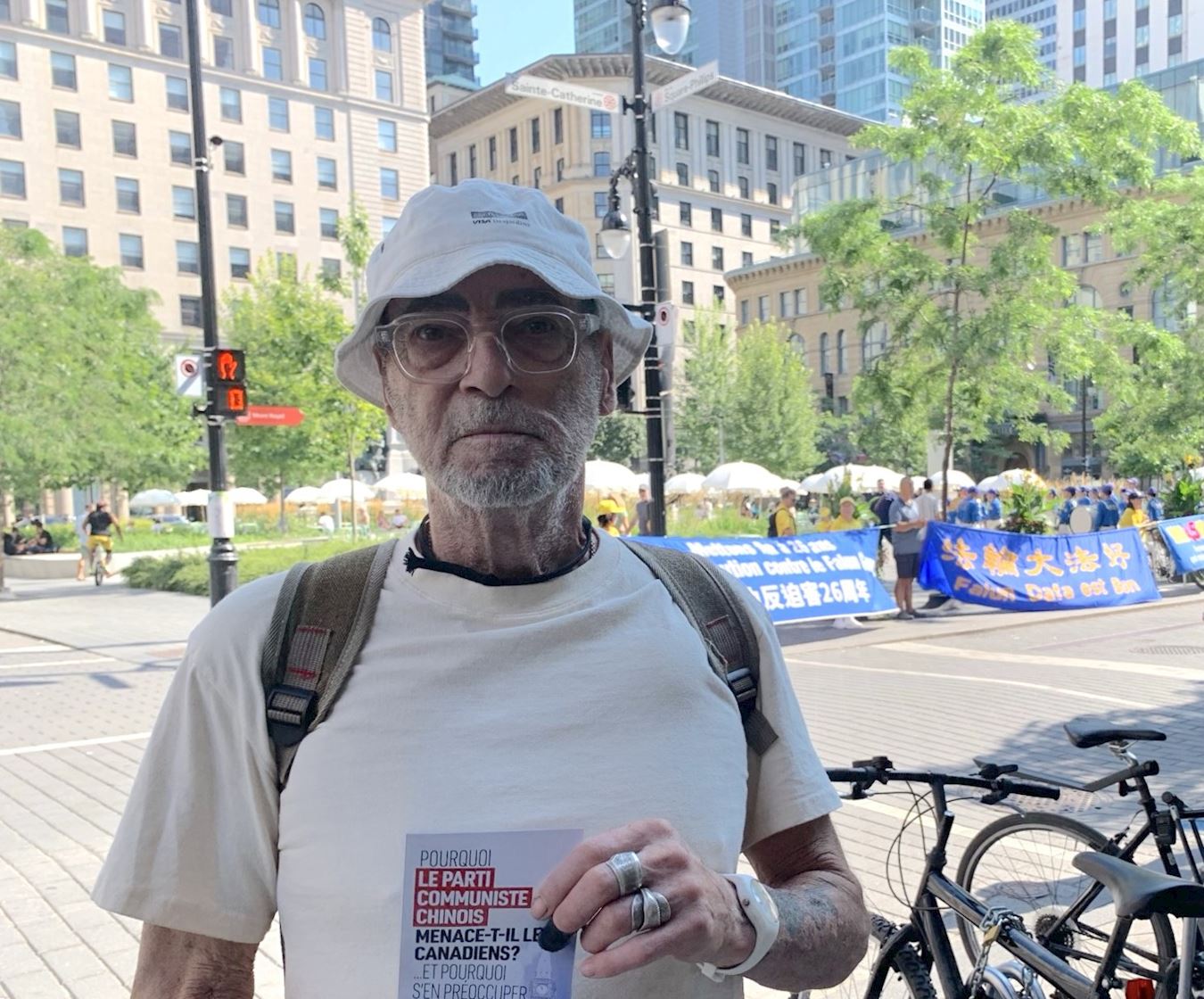 蒙特利爾市民赫讓(Rejean)駐足聆聽法輪功學員的發言後說:「我為他們鼓掌,因為這很有價值。我無法想像聽到這樣的發言而不停下腳步,得去聽、去理解。現在我明白了。我想對中國人民說:你們擁有美好的文化、幾千年的歷史,但絕不應該擁有迫害,這樣的迫害不能讓它存在。」