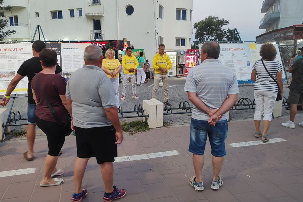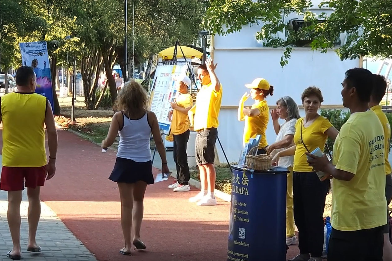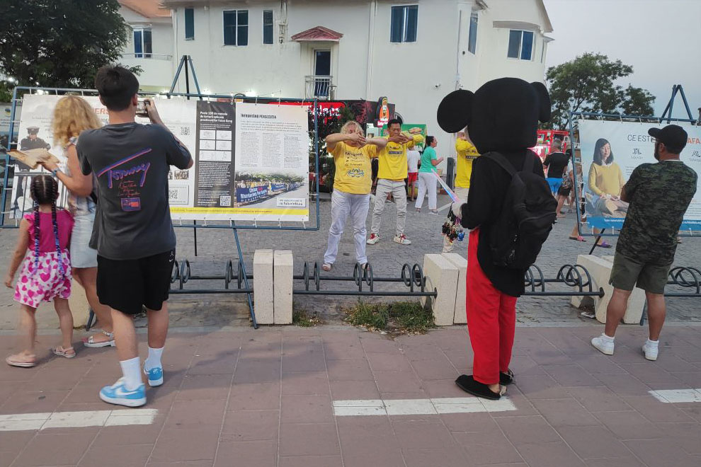 圖1:二零二五年八月九日,羅馬尼亞法輪功學員在曼加利亞港舉辦信息日活動,向民眾發放資料介紹法輪功,和展示五套功法。