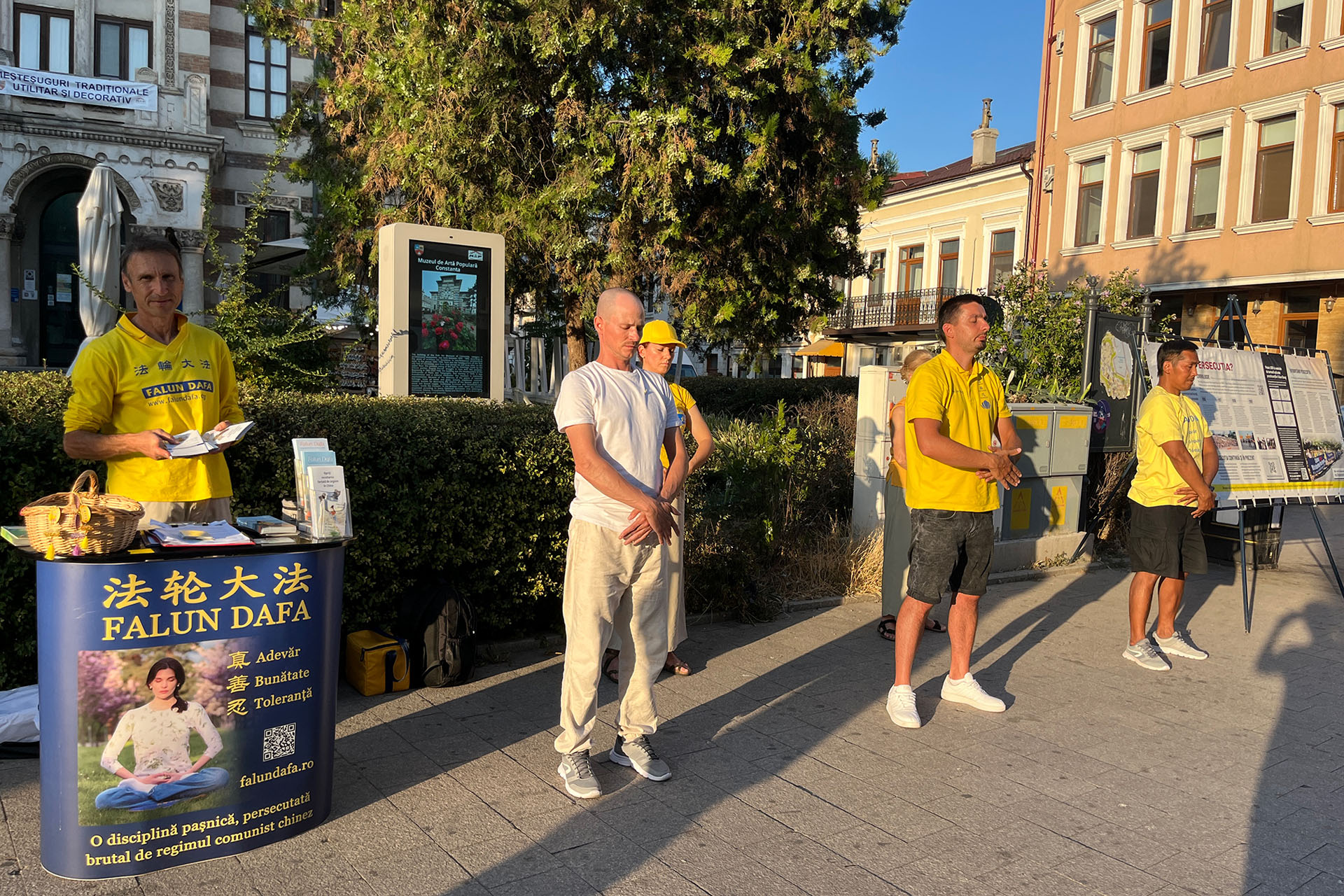 圖3:二零二五年八月十一日,羅馬尼亞法輪功學員在北埃福列舉辦信息日活動,很多民眾駐足了解真相。