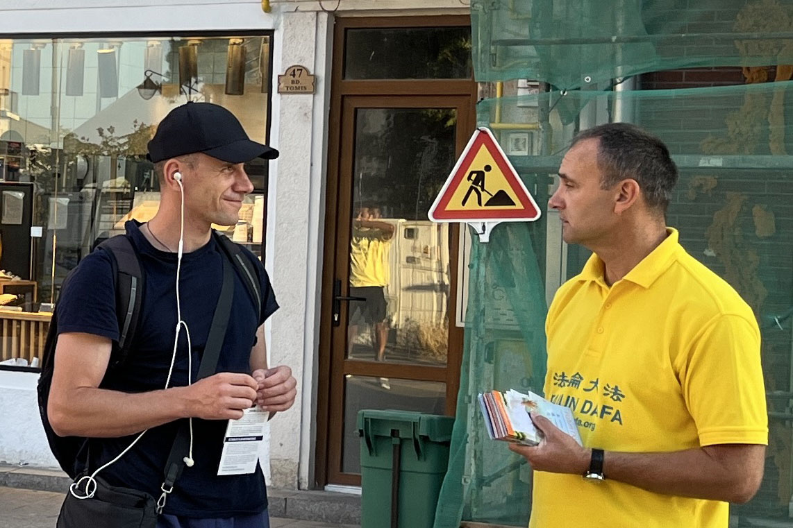 圖8:二零二五年八月十二日在康斯坦察,高中生大衛(右)表示,(法輪大法)教導的原則非常好,每個人都應該嘗試一下。