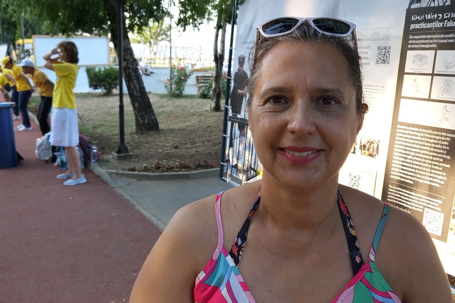 在南埃福列,路人弗洛麗娜﹒奧內塞斯庫(Florina Oncescu)被法輪功展位上「法輪大法」幾個大字所吸引,她說自己曾經聽說過法輪功:「我在谷歌上讀到過關於這種(修煉的)信息。得知(迫害的)真相,我感到很難過。應該讓人們更多的了解法輪功對健康、發展和平衡的好處。我就是這樣看到的,我真的很喜歡這些(關於法輪功學員們的)內容。」