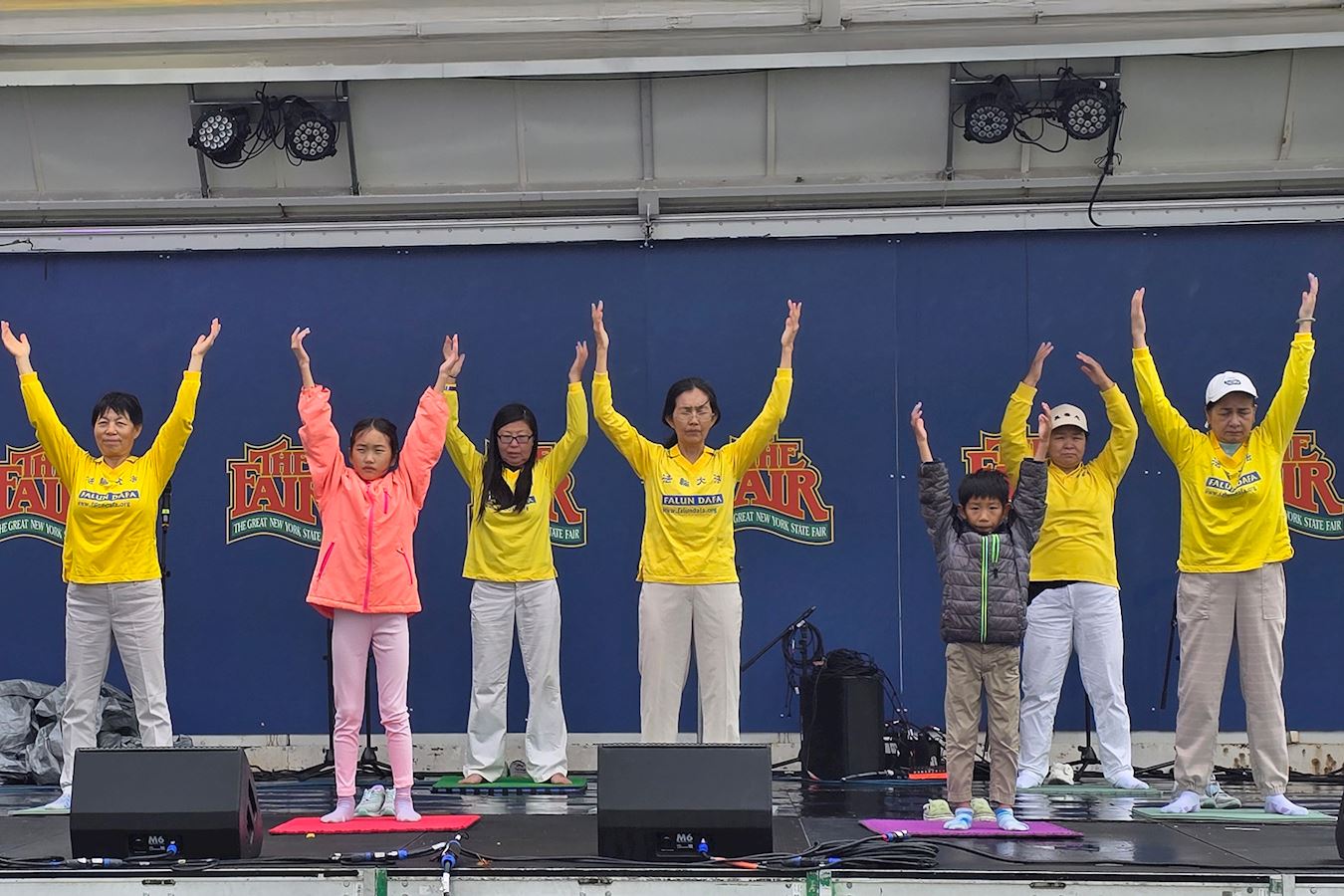 八月二十日上午,紐約上州法輪功學員受邀接受當地ABC電視台WSYR9台「Bridge Street」節目的現場採訪。法輪功學員在舞台上展示了五套功法,舒展寧靜的動作在細雨中格外動人。