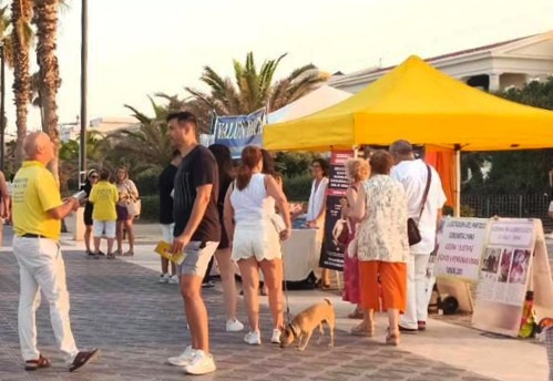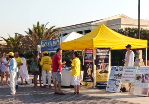 法輪功學員在這裏設立信息展位,嚮往來遊客們發放真相傳單,揭露中共殘酷迫害法輪功學員以及活摘器官的累累惡行,許多遊客攜全家簽署請願書:呼籲停止中共對法輪功學員的迫害和活摘器官行徑,該簽名表將提交給西班牙眾議院請願委員會。同時也有學員演示法輪大法的五套功法,展示大法的美好與祥和。