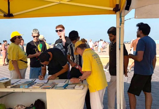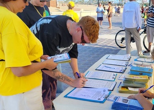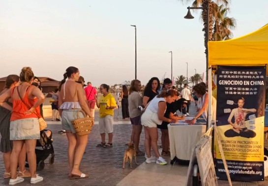 【明慧網二零二五年八月三十一日】二零二五年八月十日上午十一點至下午九點,西班牙法輪功學員在東南部地中海城市巴倫西亞馬爾瓦羅薩(Malvarrosa)海灘的海濱大道舉辦反對中共迫害法輪功的徵簽活動,不少民眾簽名支持並開始學煉法輪功。
