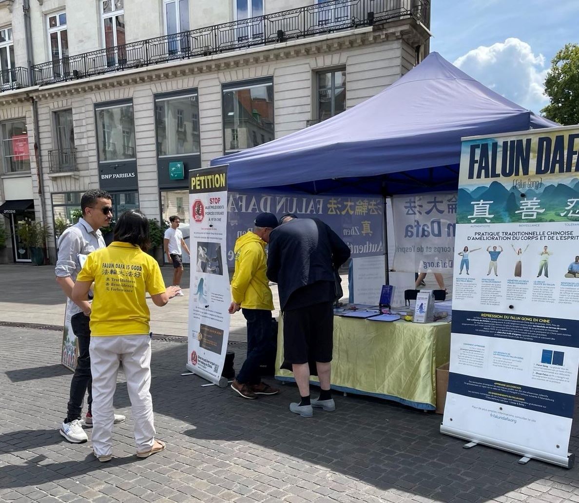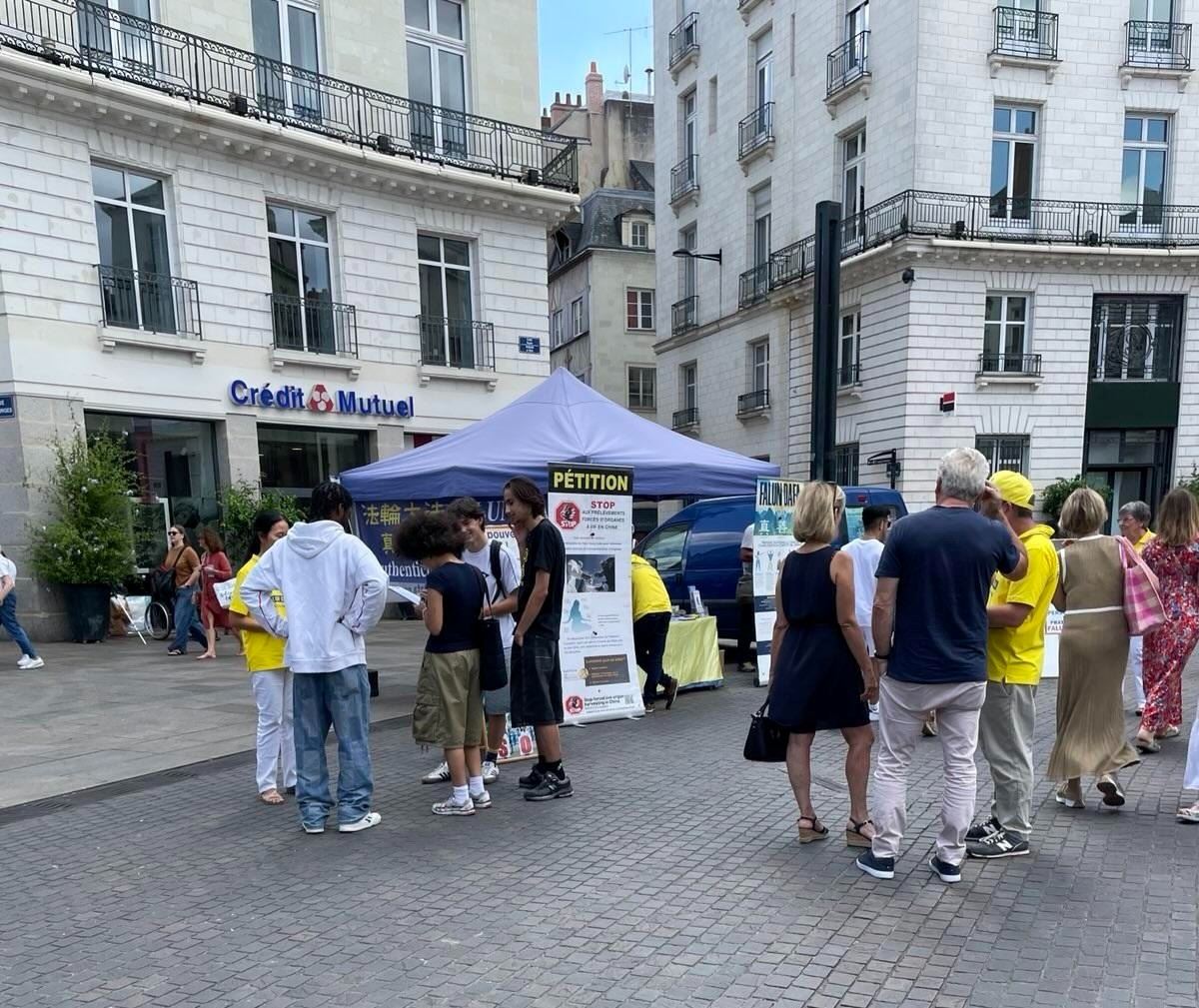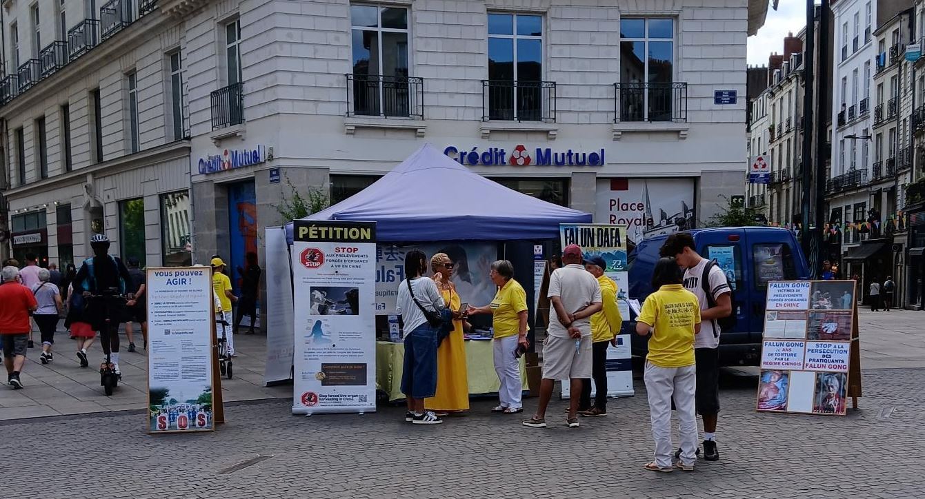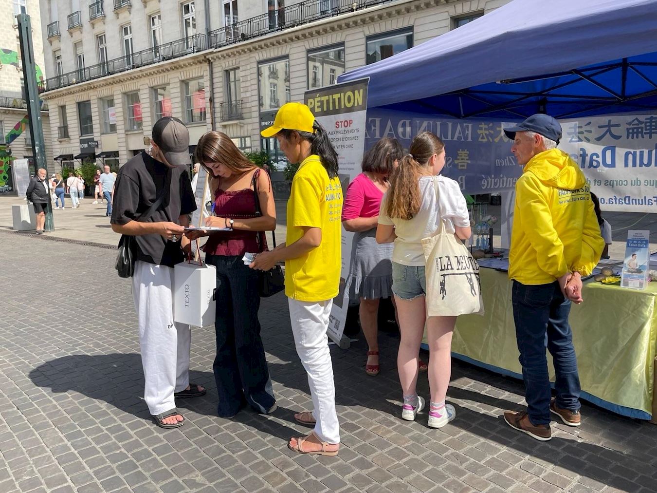 居住在南特的退休婦女瑪麗-保爾(Marie-Paule)對法輪大法表示了濃厚的興趣。得知這種修煉方法及其修煉者在中國已經遭受中共迫害二十六年後,她表示這是不可理解的。當她得知修煉者被當作器官庫時,她感到憤怒。她還表示,她的腎臟功能不佳,對她來說要麼是移植,要麼是透析。然後她補充說,不應該去中國助長這種交易。在離開之前,她簽署了請願書,並拿了傳單資料以便學煉法輪功。她感謝法輪功學員的行動。