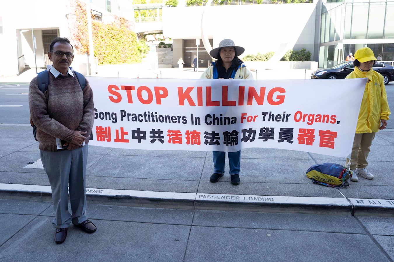 來自印度的器官移植醫生斯瓦拉﹒卡姆(Swara Kkam)主動走到法輪功學員打出的橫幅「制止中共活摘法輪功學員器官」面前,並幫助把橫幅擺正。他表示,作為器官移植醫生,他已經做了三千例腎臟器官移植手術,這些手術都是經過同意的,「但是中國醫生不經人同意就強制摘取器官,這是非法的。」