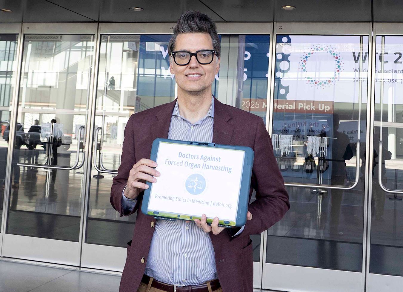 他表示,據他所知,只有百分之五到百分之十的醫生、護士和社會工作者了解在中國發生的活摘器官罪行,「中共已經將器官移植武器化,以達到根除法輪功的目的。所以我們今天在這裏,希望參與器官移植的醫生了解真相,希望他們能站出來幫助制止在中國發生的迫害法輪功學員和維吾爾族人的行徑。」