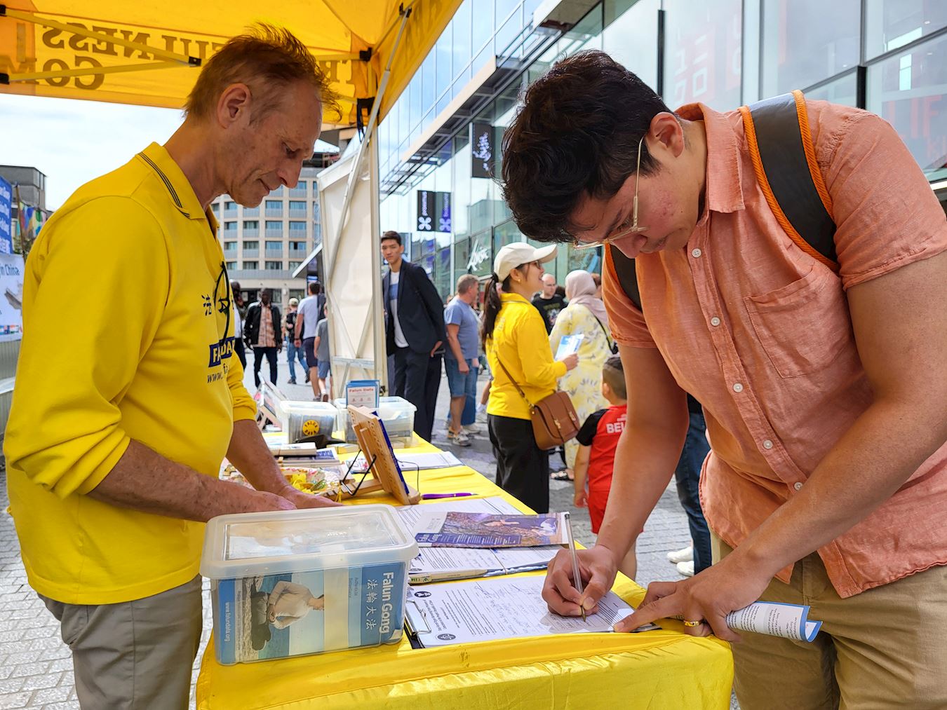 尼克拉斯(Nicolas)與學員交談了解法輪功和迫害真相,並簽名反活摘。
