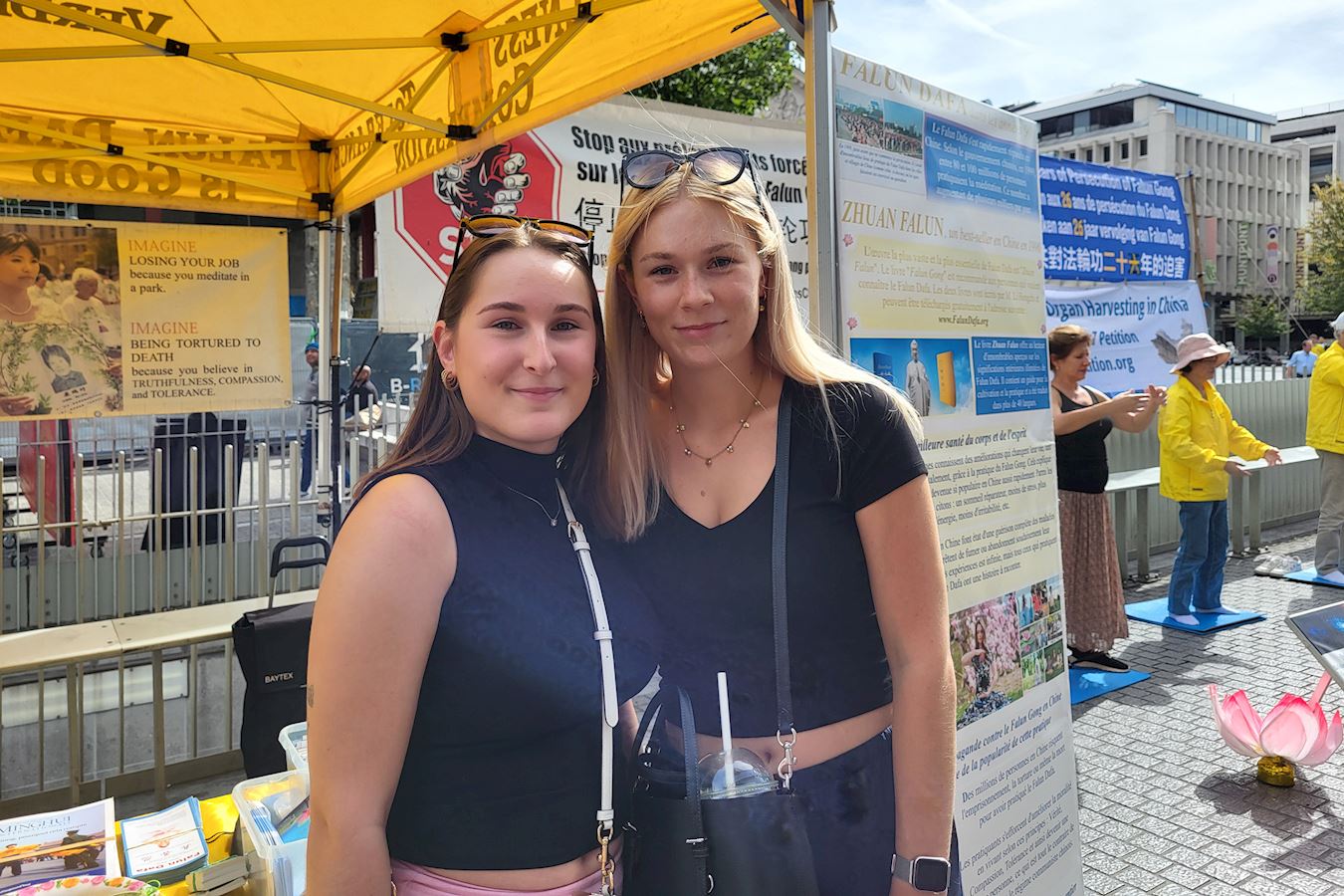 卡羅琳(Caroline)和費德裏卡(Federica)被現場的功法演示和信息展示所吸引,交談中表達了對法輪功學員的支持。「我從來沒有聽說過法輪大法,這是第一次了解。」卡羅琳表示,「他們在呼籲停止迫害,已經持續了二十六年,真的很震驚。」她說:「有很多人被關押,太可怕了。人們被殺害,只為了強取器官,這真的令人難以接受。」
