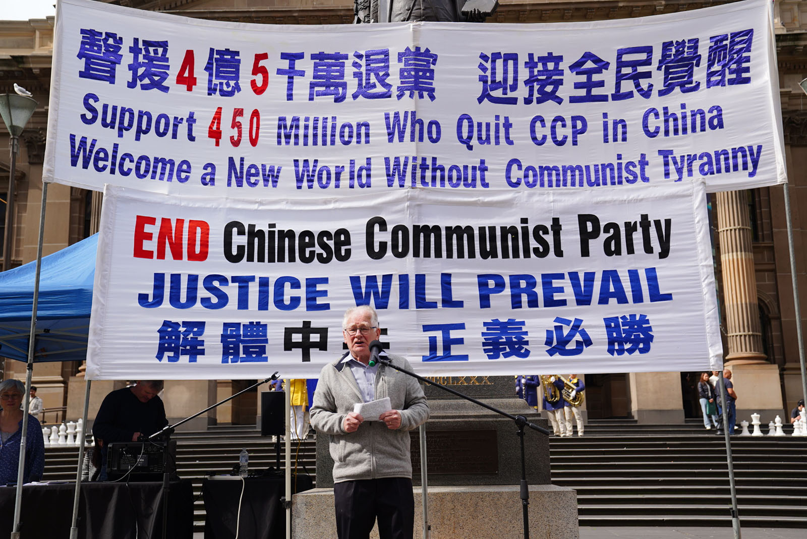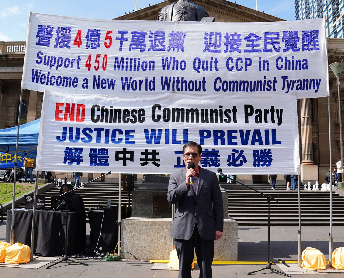 全球退黨服務中心墨爾本分部發言人孫先生在集會上表示,4.5億人三退,「代表著生命的覺醒、良知的復甦,以及人類對暴政的抗爭」。
