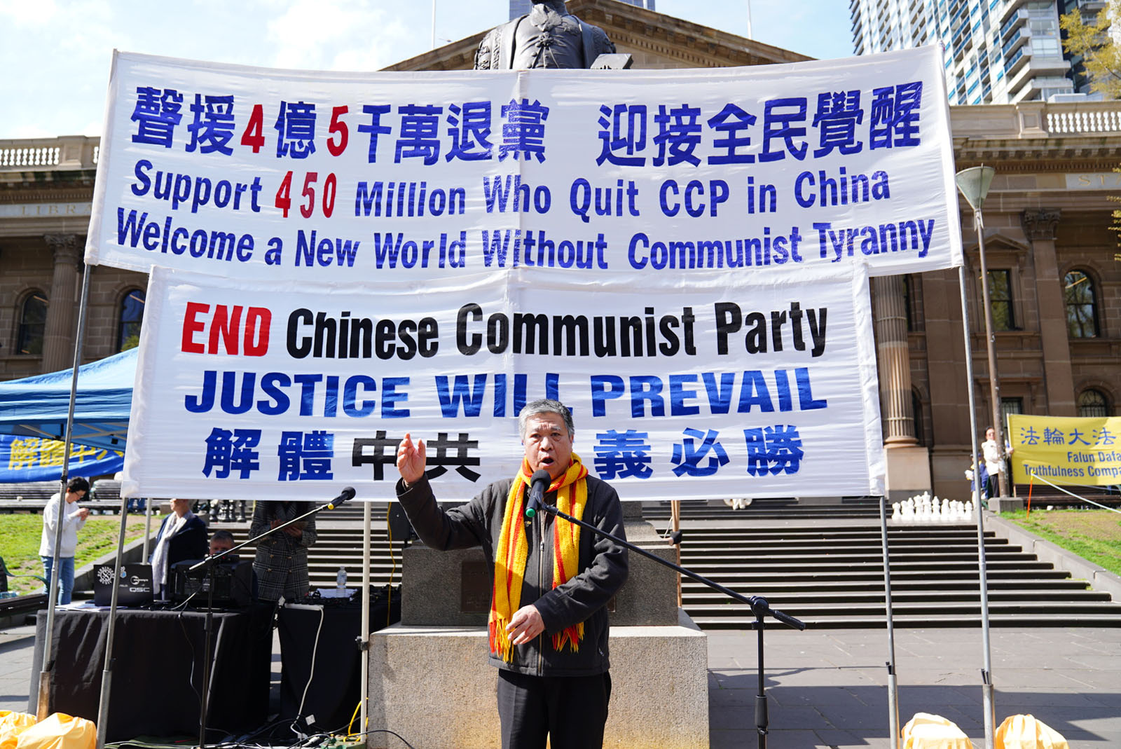 「二零零五年,法輪功學員發起『三退』,墨爾本民運聯盟立即積極響應,每一位成員都在三退聲明上簽上了自己的名字……在這場波瀾壯闊的『三退』運動中,中國人民是以和平解體中共邪教。」他說,「退出中共不是政治鬥爭,而是道德選擇;不是權力爭鬥,而是靈魂的救贖!