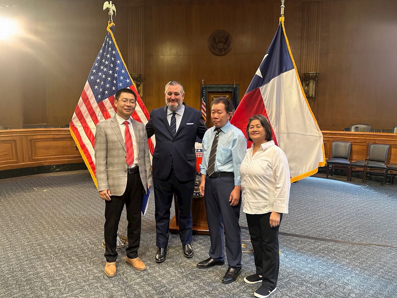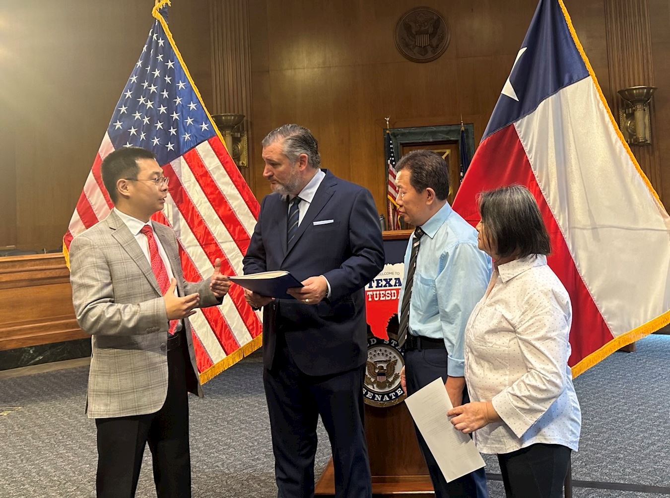 九月十六日上午九點半,泰德﹒克魯茲參議員在美國參議院德克森辦公樓舉辦咖啡見面會(coffee hour)。咖啡見面會是國會常見的一種小型聚會,議員們可以在輕鬆的環境下和選民面對面交流問題,聽取意見。在政府部門任審計師的德州法輪功學員宇昊等在見面會上將這十封來自德州議員的支持和感謝信遞交給了克魯茲參議員。