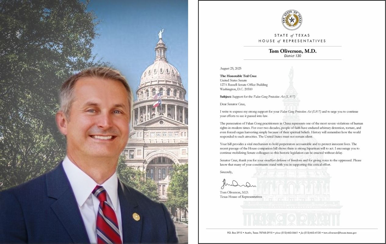 德州眾議院多數黨領袖、第十五選區資深眾議員湯姆﹒奧利弗森(Tom Oliverson)醫師在信中說:「二十多年來,這些有信仰的人們僅僅因為他們的精神信仰就被肆意拘留,酷刑折磨,甚至活摘器官。歷史會銘記這個世界對這些暴行做出了怎樣的回應,美國千萬不能保持沉默。」
