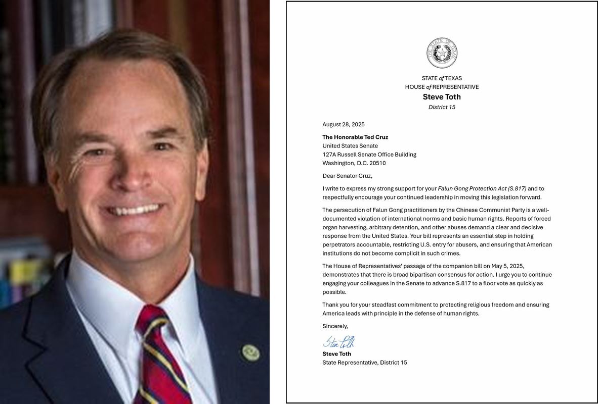 德州眾議院第十五選區資深眾議員史蒂夫﹒托特(Steve Toth)在信中說:「中共對法輪功修煉者的迫害明顯違反國際準則,也是對基本人權的嚴重侵犯,其證據十分充足。有關活摘器官、任意拘押及其它暴行的報告,要求美國作出明確且果斷的回應。您提出的法案是追究罪責、限制施暴者入境美國、並確保美國機構不會淪為此類罪行共犯的必要步驟。」