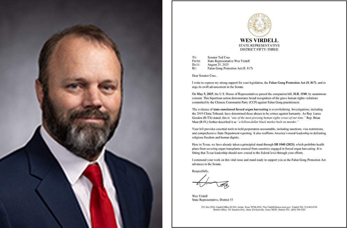 德州眾議院第五十三選區眾議員韋斯﹒維爾德爾(Wes Virdell)致信克魯茲參議員,表達對《法輪功保護法案》的強烈支持,並敦促該法案在參議院迅速推進。