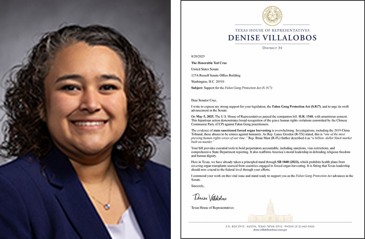德州第三十四選區眾議員丹妮絲﹒維拉洛博斯(Denise Villalobos)致信感謝克魯茲參議員在這一關鍵議題上的努力。她說:「隨著《法輪功保護法案》在美國參議院推進,我隨時準備給予支持。」