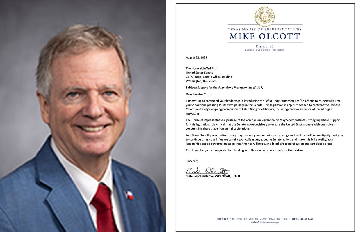 德州第六十選區州眾議員麥克﹒奧爾科特(Mike Olcott)在信中說:「此立法刻不容緩,旨在應對中共持續迫害法輪功修煉者的行徑,包括活摘器官的可信證據。」