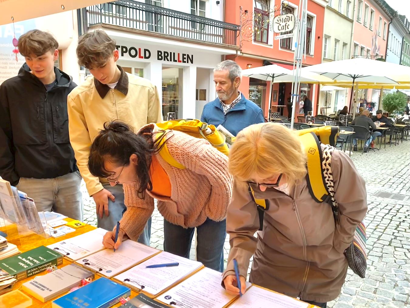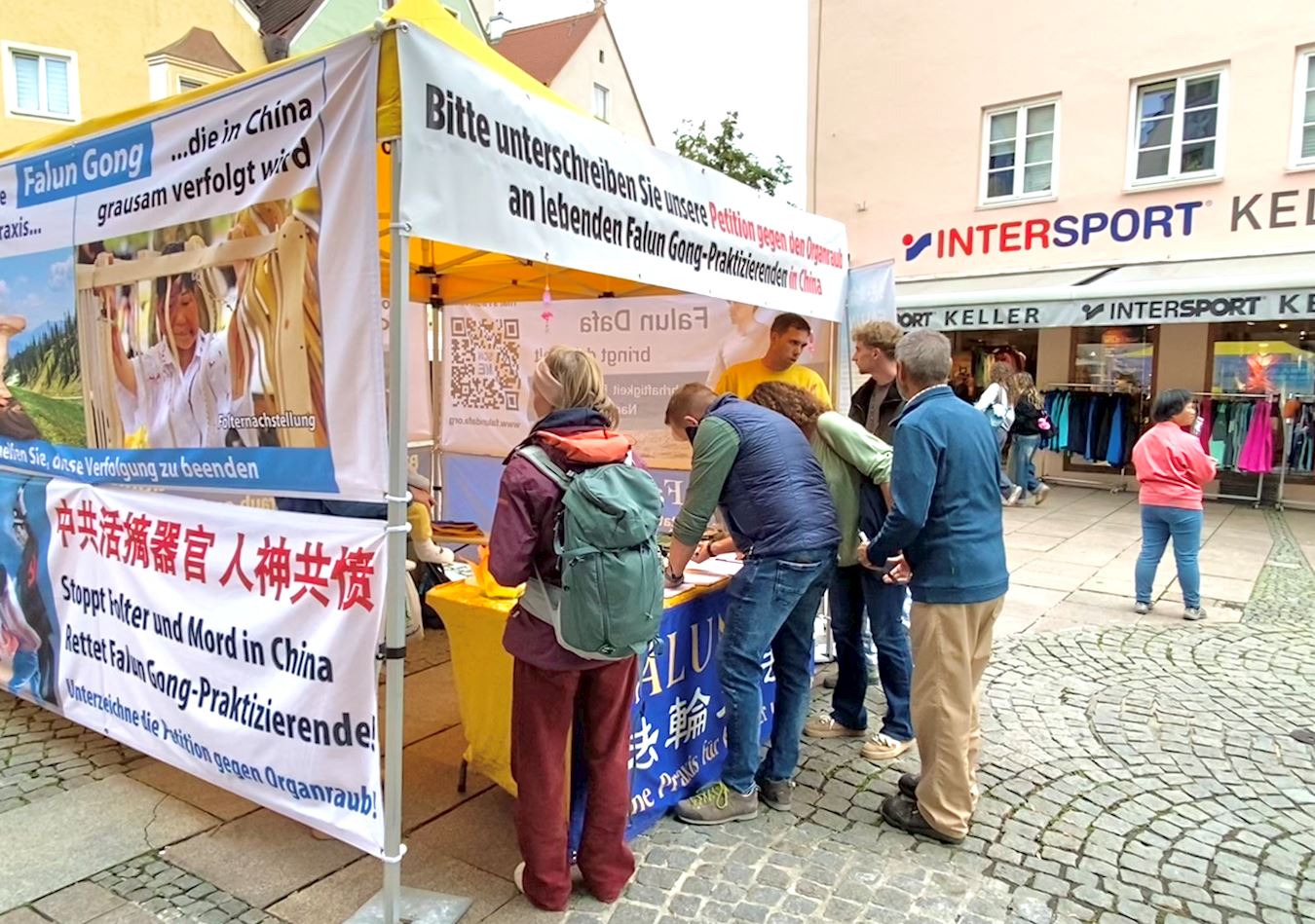 法輪功學員的展位設置在市中心城市噴泉(Stadtbrunnen),學員展示功法,掛出橫幅,向路人講述法輪功真、善、忍理念,揭露中共迫害法輪功的真相,很多人停下腳步與學員交談。當他們了解了法輪功學員反迫害的真相之後,紛紛簽名制止中共迫害。