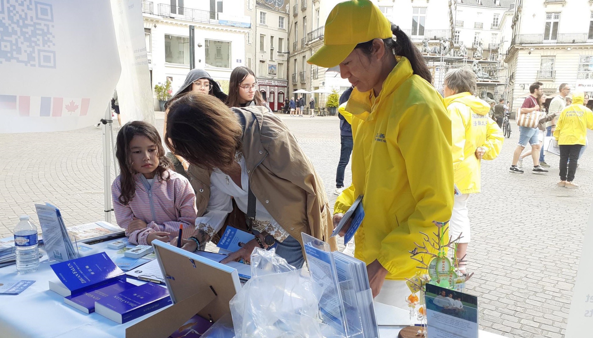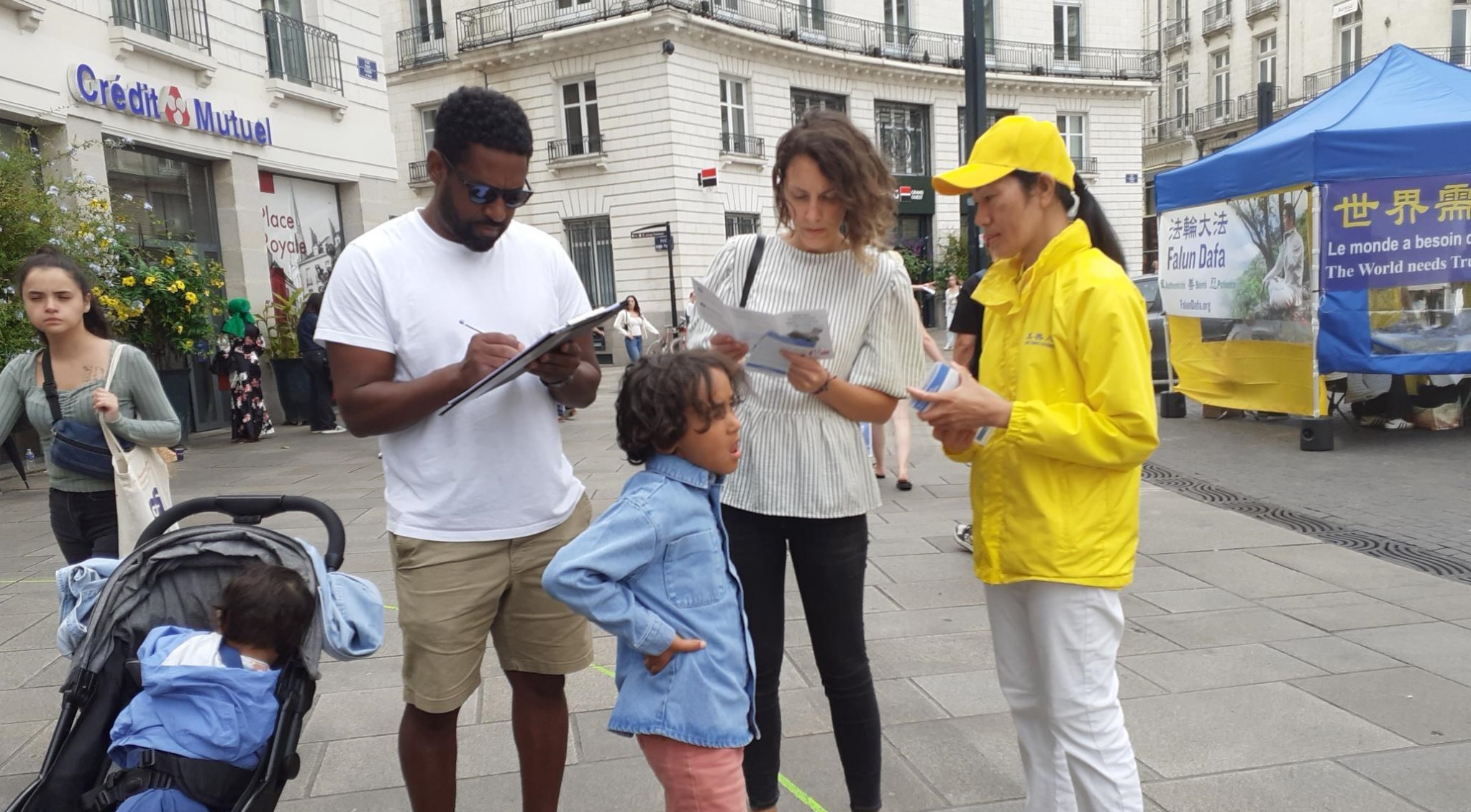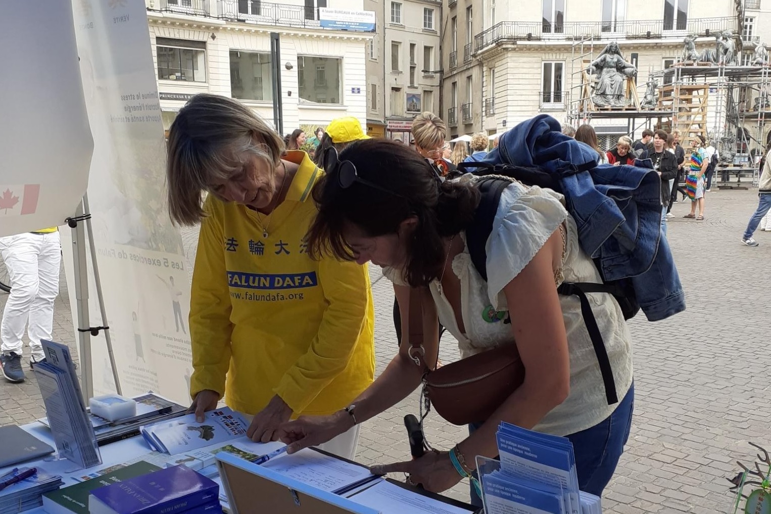 一位年輕女孩看到法輪功真相標語後,立刻打電話給她在尼斯的媽媽,告訴她在南特有一個法輪大法的展位。她簽署了請願書,並表示她的母親是位人權工作者,也支持法輪功的反迫害。於是,法輪功學員贈送她的母親法文版的《明慧報告:法輪功在中國大陸被迫害二十年》,這讓她非常感動。
